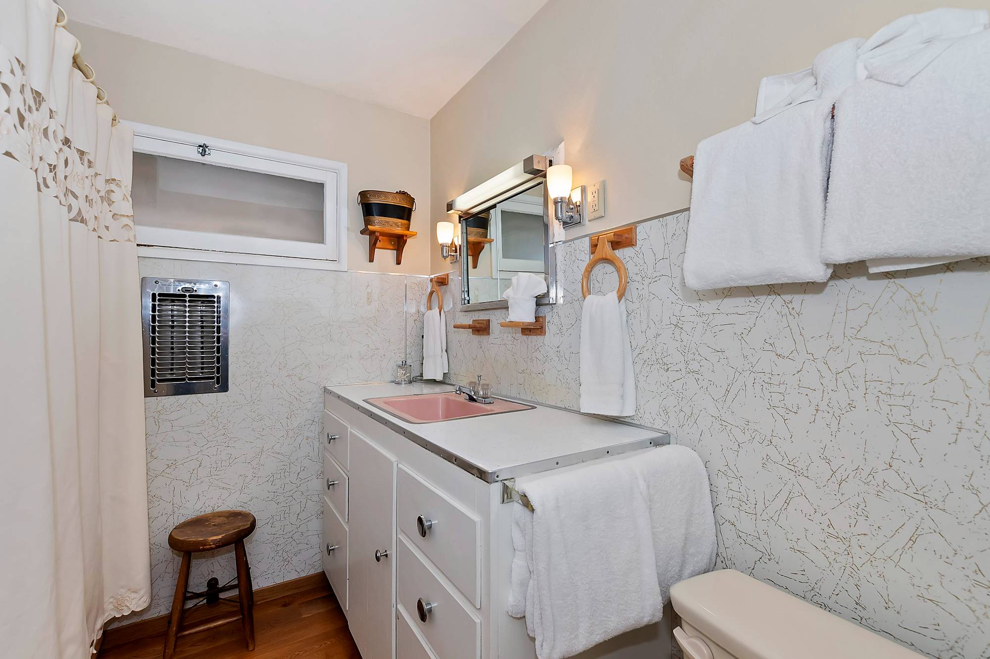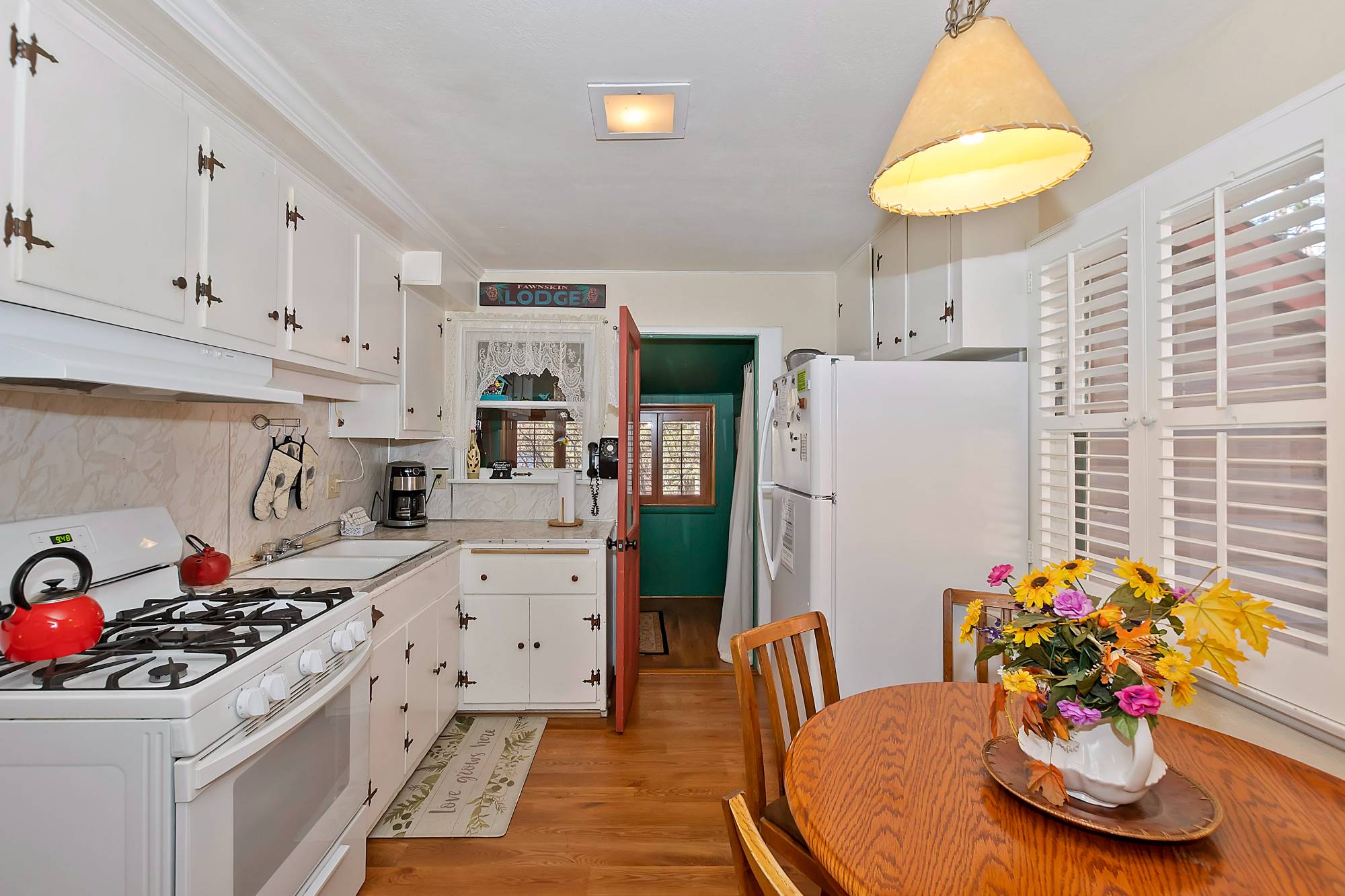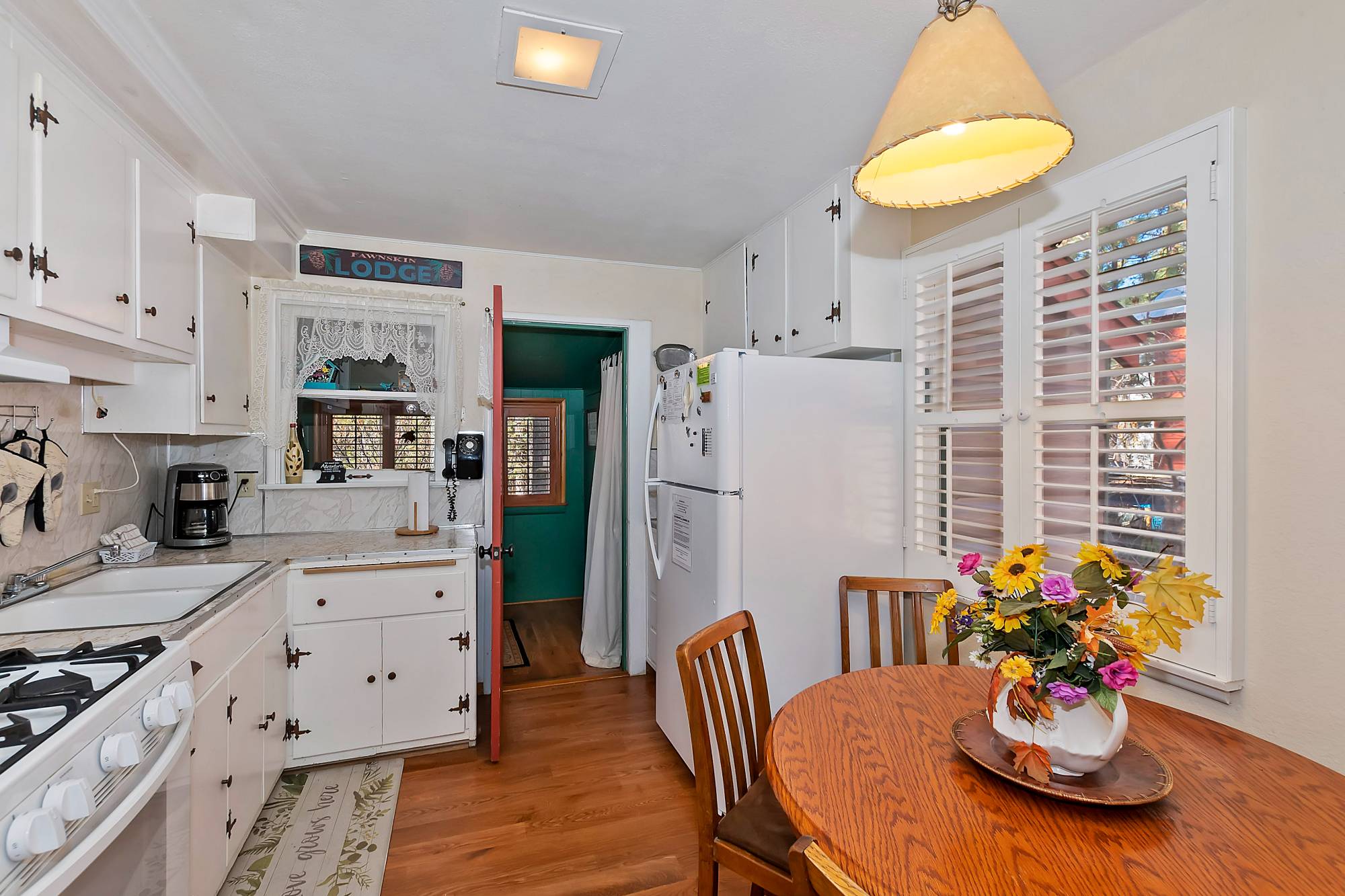 ✓ Retro Kitchen & Dining: The charming kitchen is fully equipped with a gas stove, microwave, coffee pot, and seating for four at the cozy dining table.