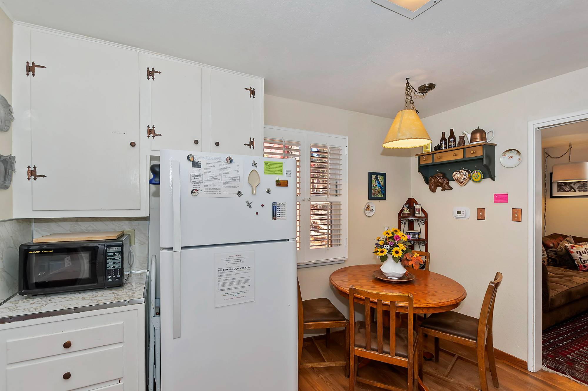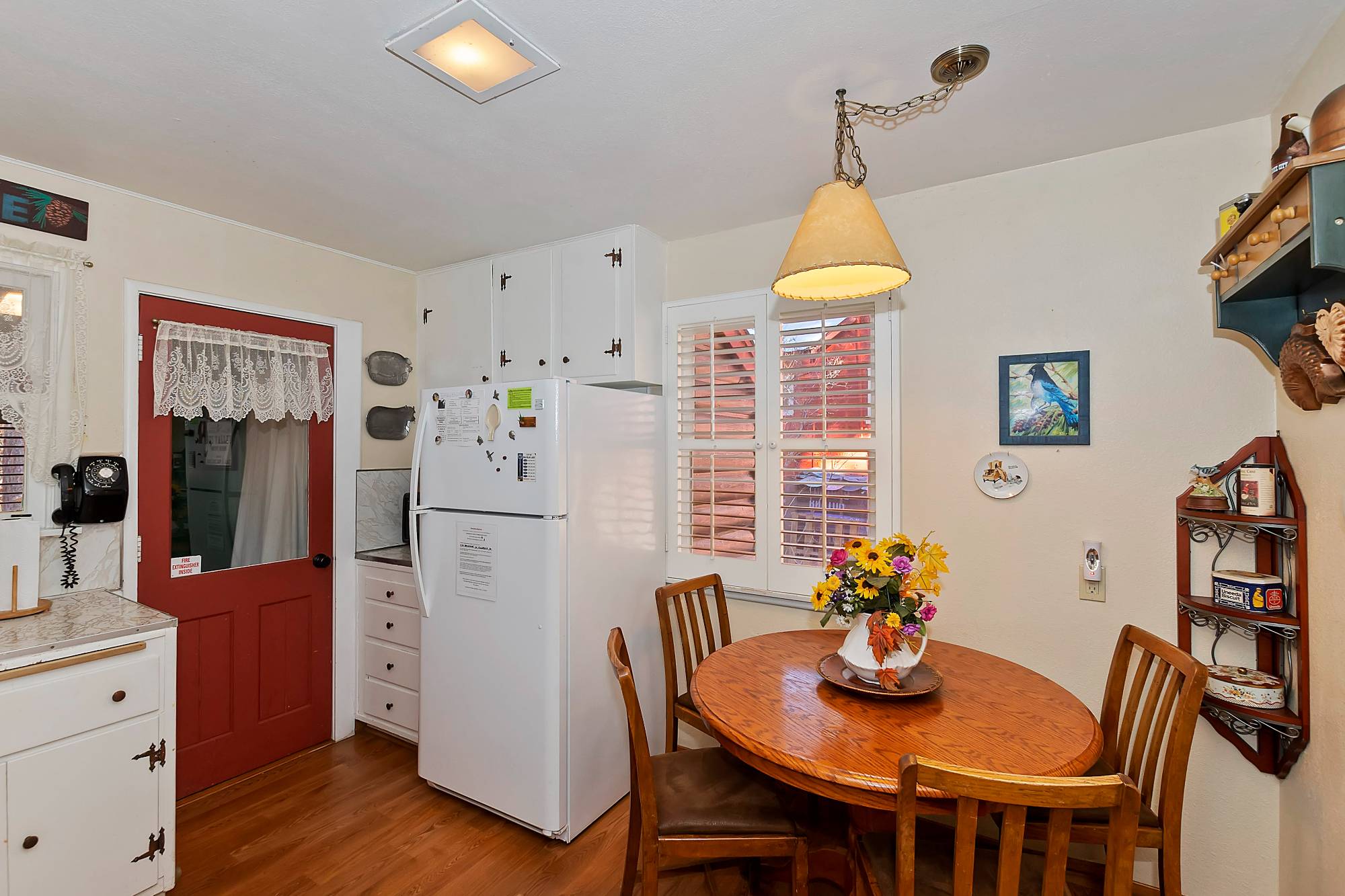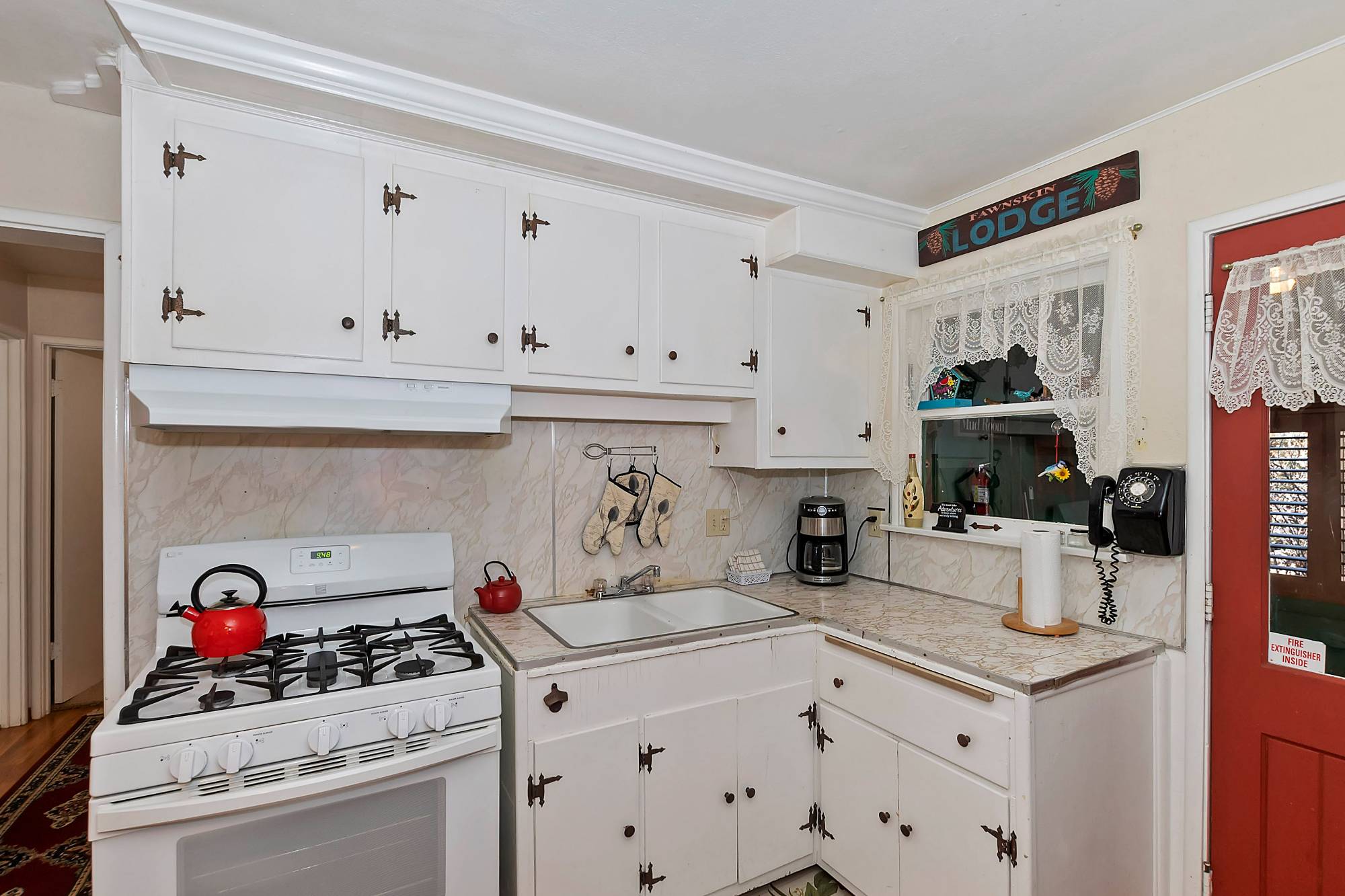 ✓ Retro Kitchen & Dining: The charming kitchen is fully equipped with a gas stove, microwave, coffee pot, and seating for four at the cozy dining table.