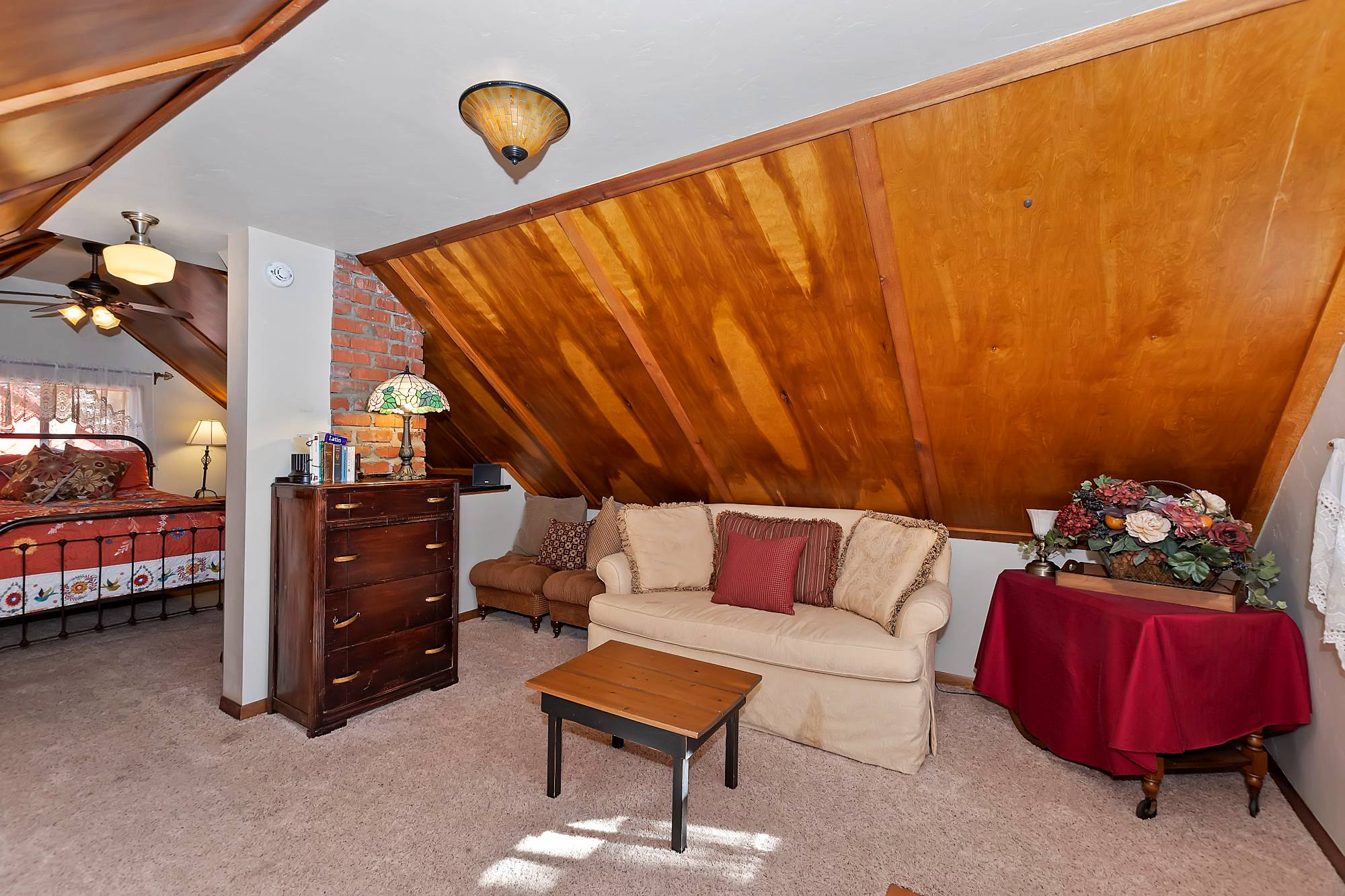✓ Private Loft: The third bedroom is a separate living area in the loft with a private entrance. It includes a sitting area with a loveseat, TV with Roku, full-sized bed, and a private bathroom with a shower—ideal for guests seeking a more private space.