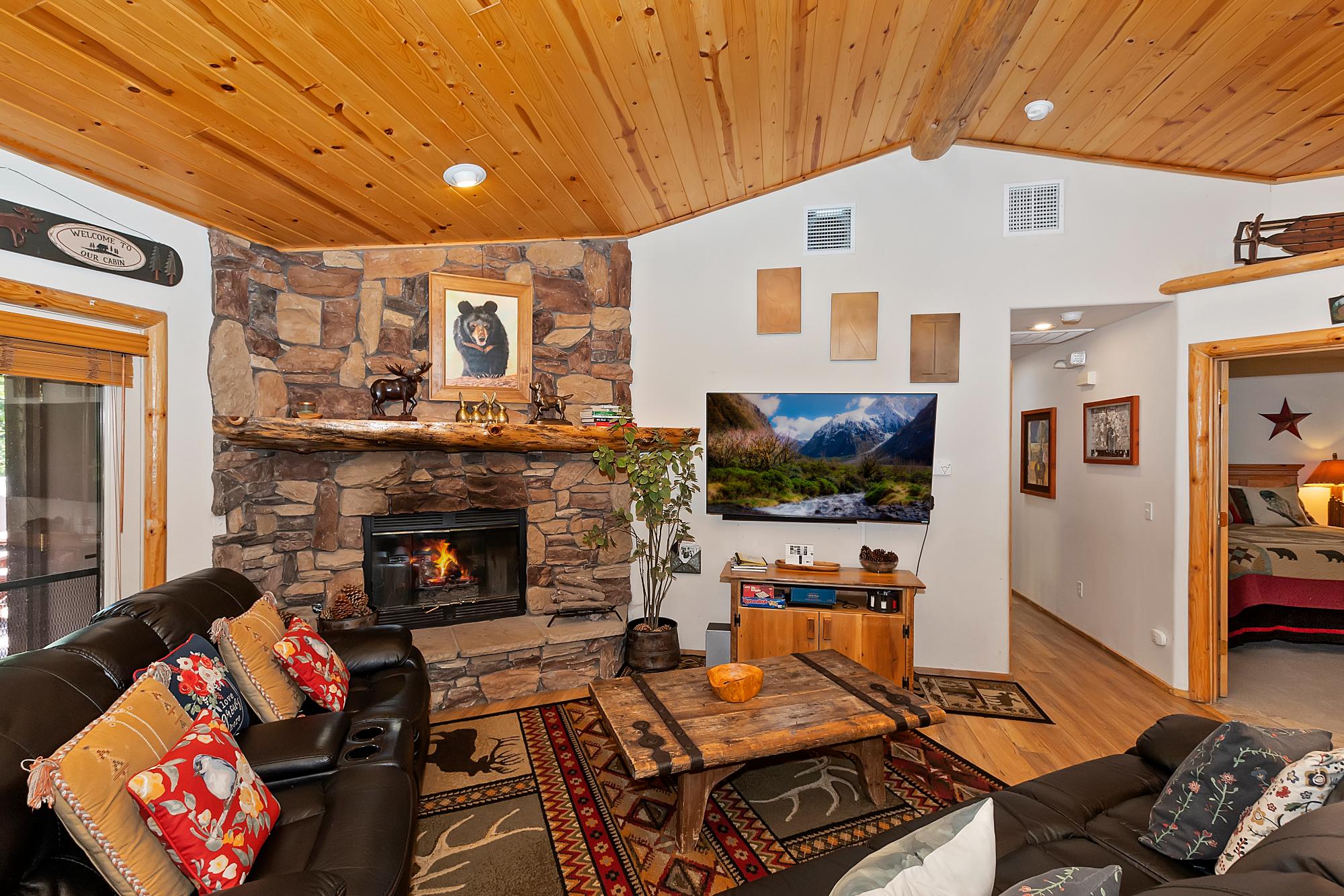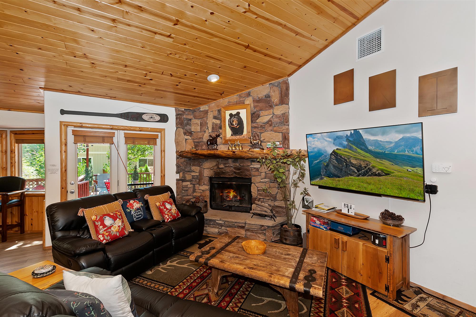 ✓Large gas fireplace with stone hearth, reclining leather sofas, flat-screen TV with 4K cable, YouTube TV, Apple TV, Hulu, Netflix, and Disney Plus.