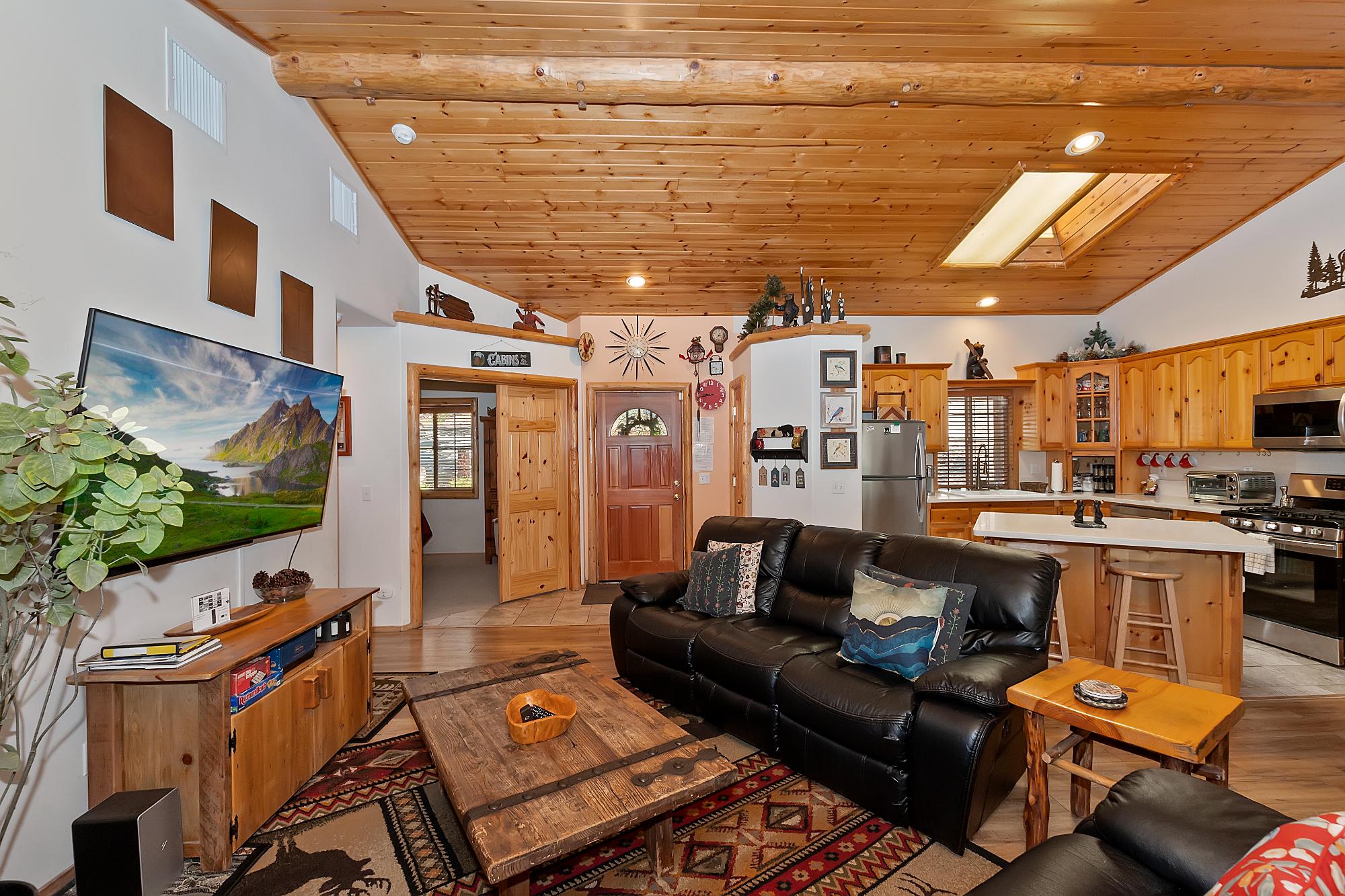 ✓Open-plan design with high wood ceilings and a mix of wood and tile flooring and gas fireplace