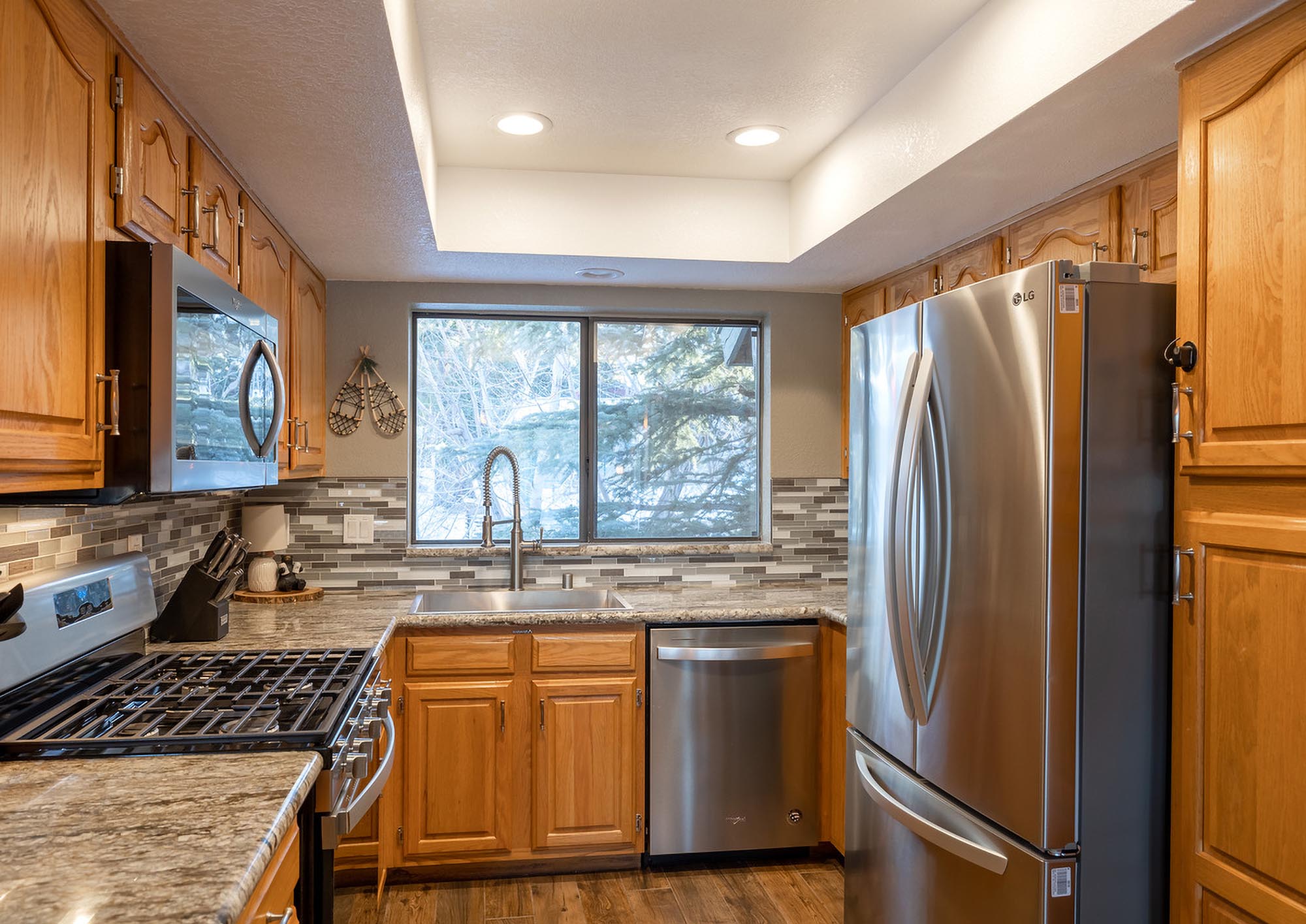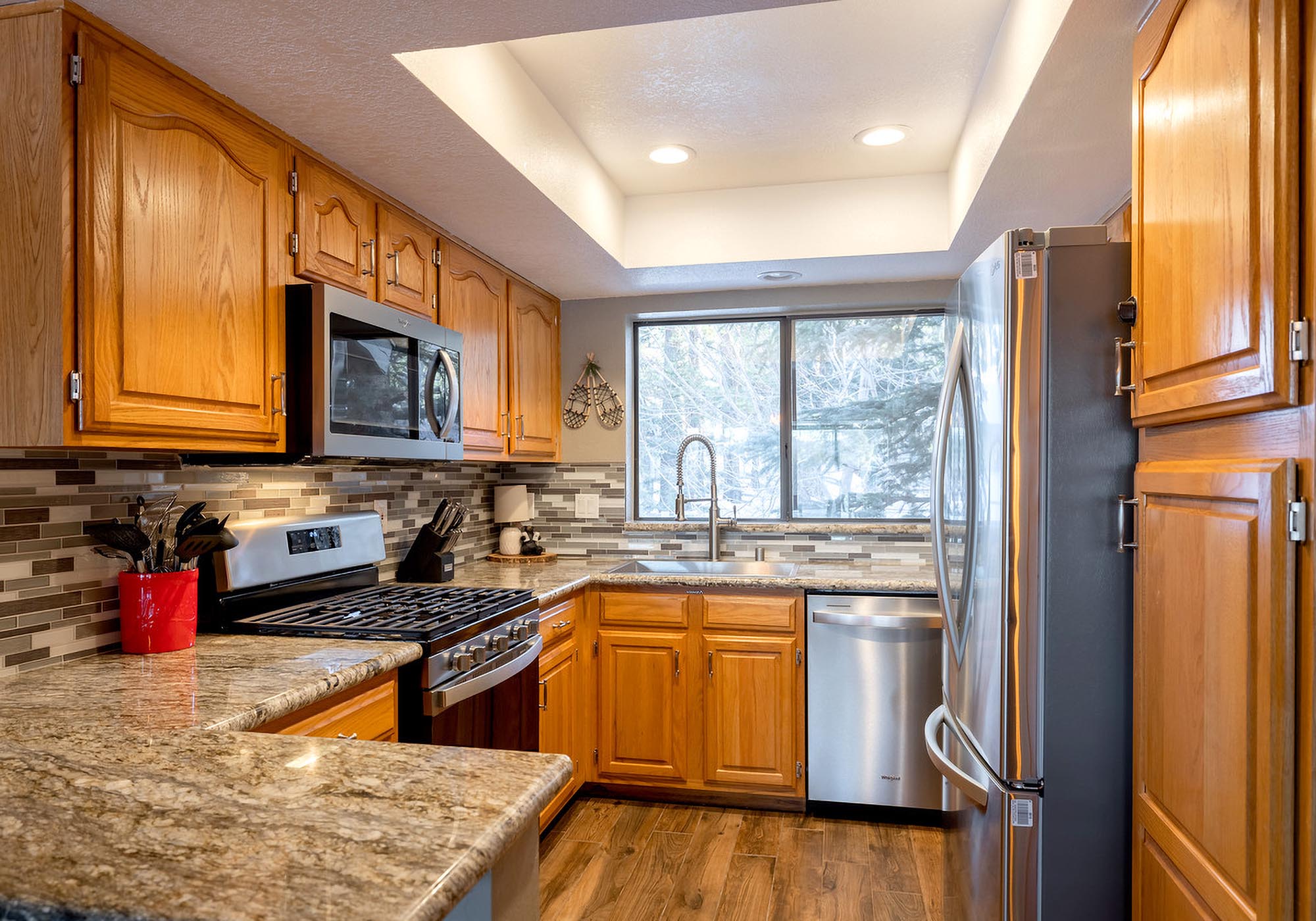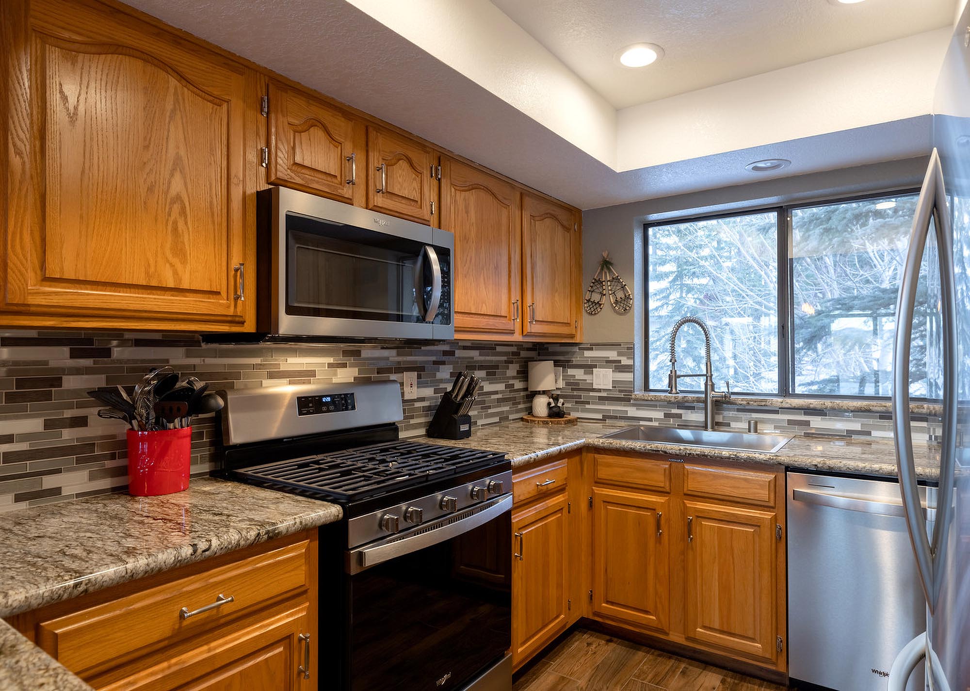 ✓ Modern kitchen with granite countertops and stainless steel appliances