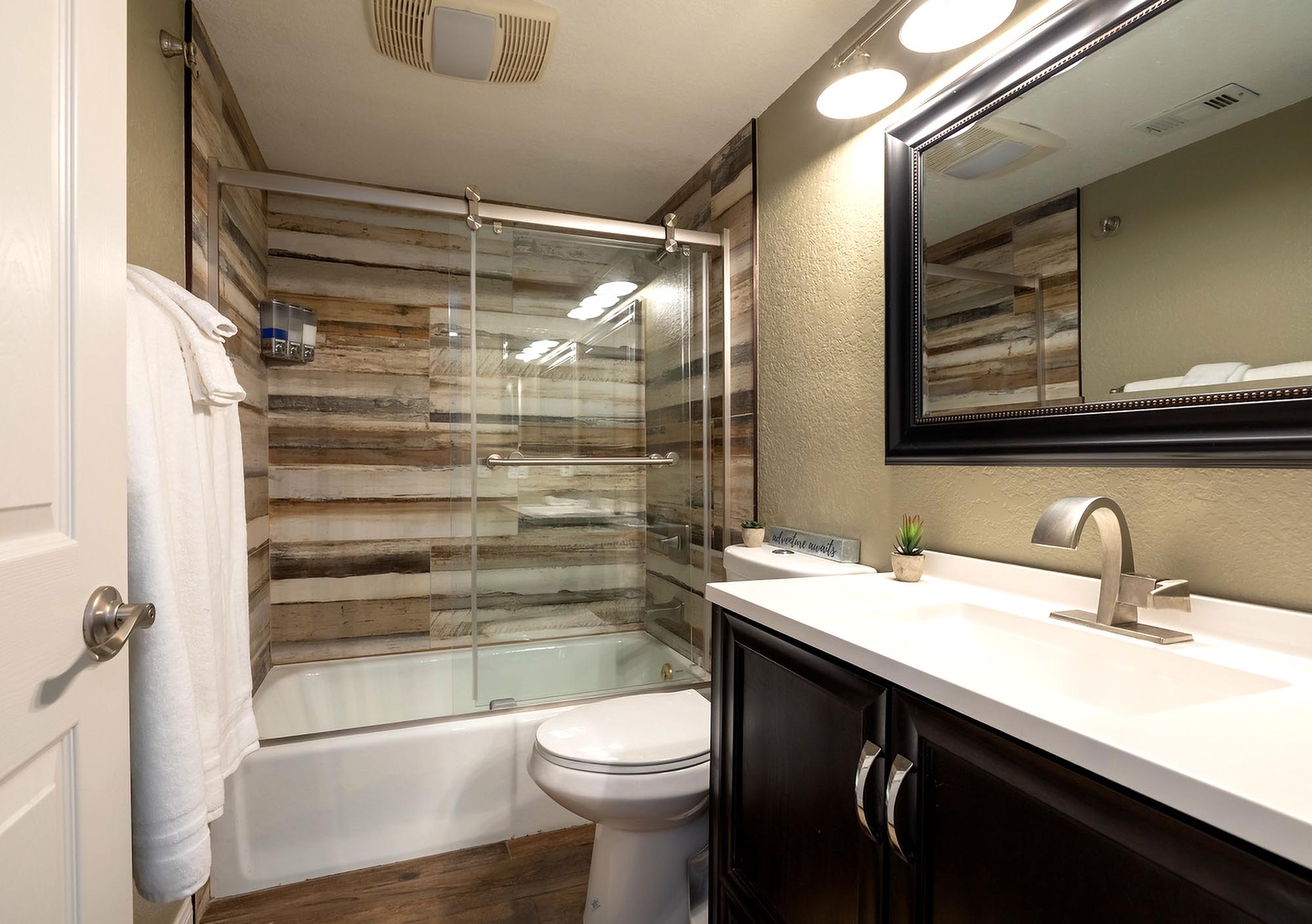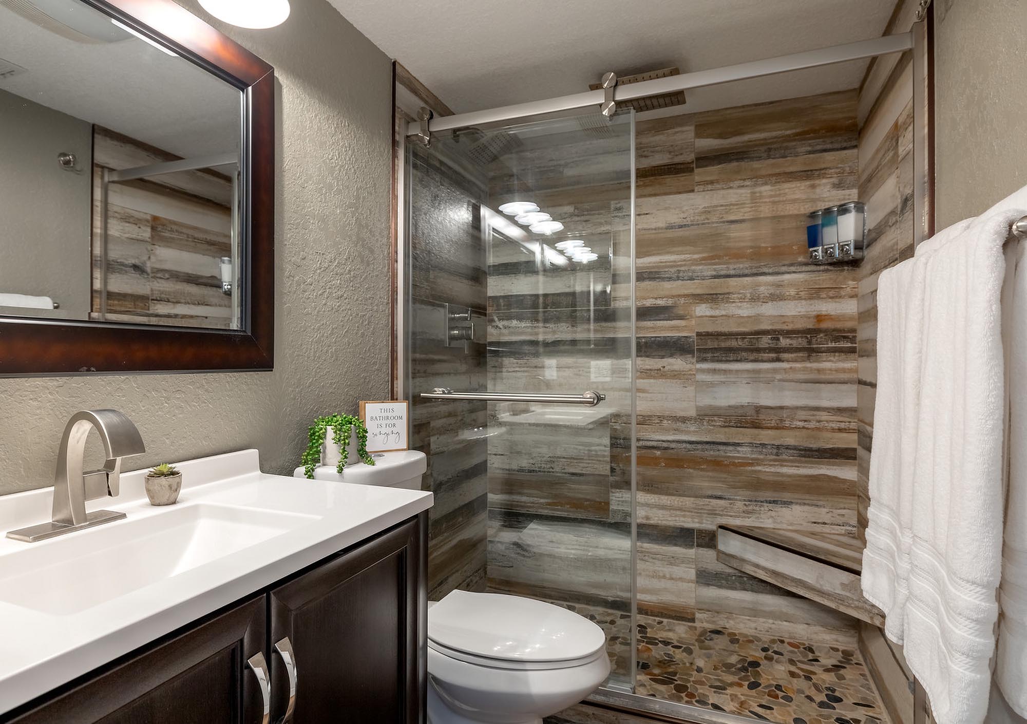 ✓ Bedroom 2: Queen bed, patio access, full bath with glass-door walk-in shower