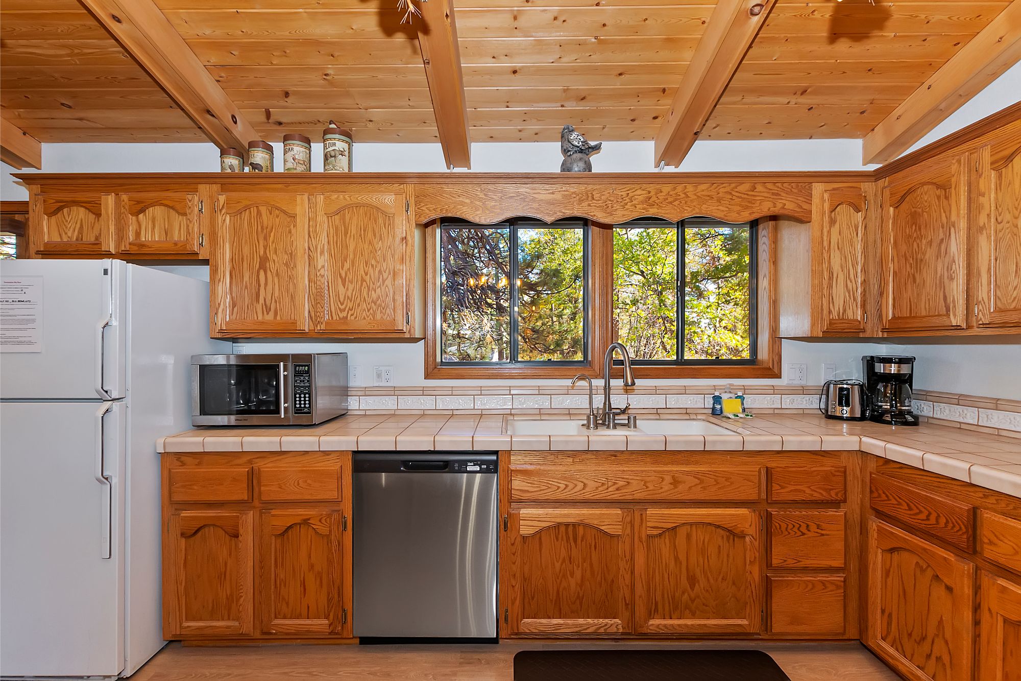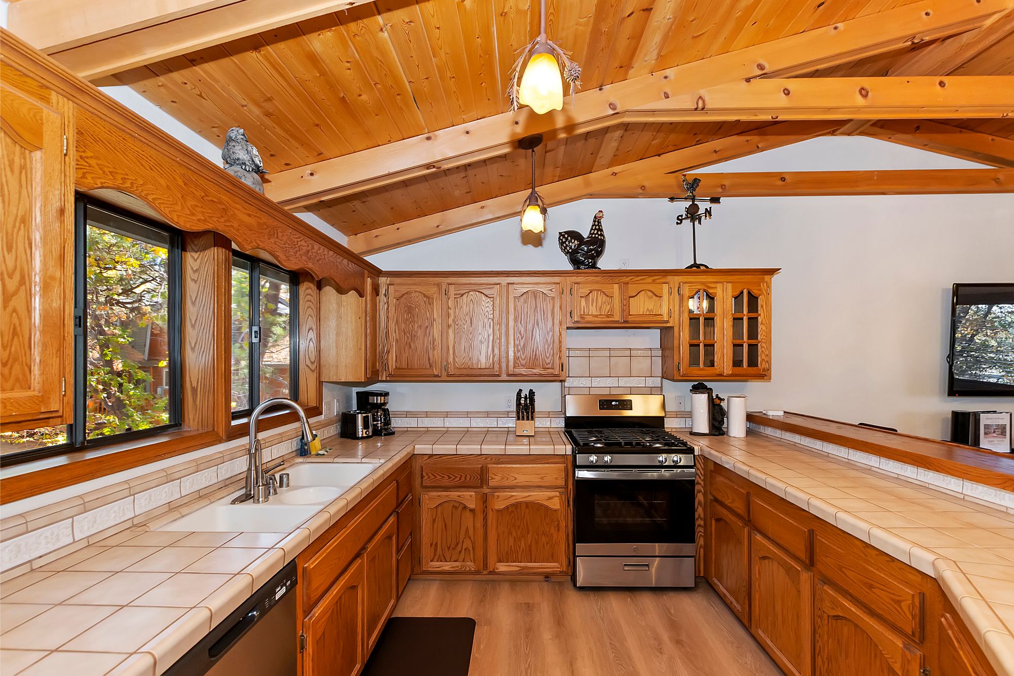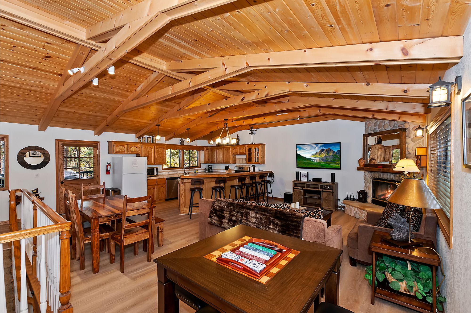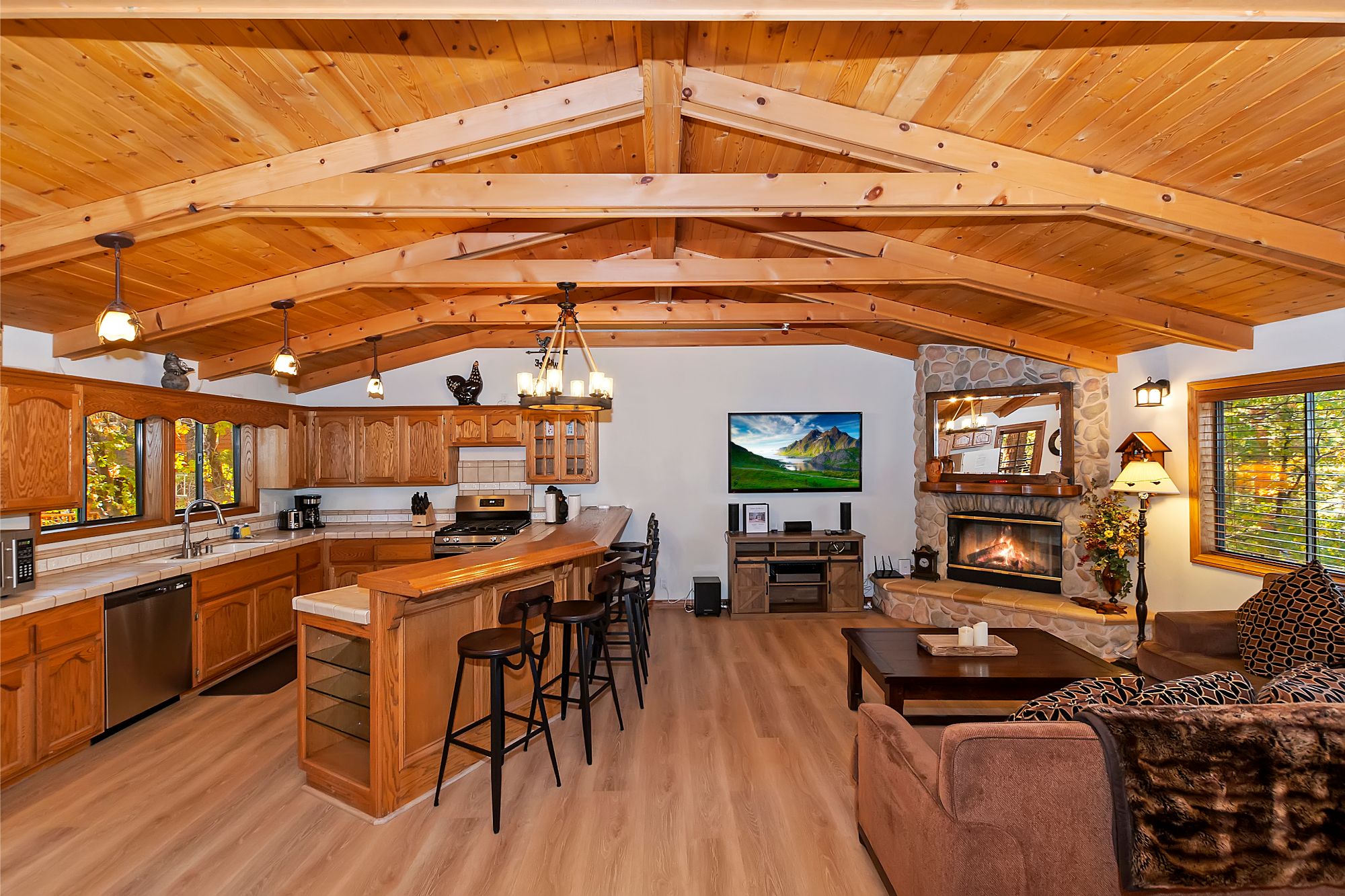✓ Open Concept Living Area: Gather around the farmhouse-style table for meals or enjoy casual seating at the breakfast bar. A card table is also available for a friendly game of poker or chess. The kitchen is fully equipped with a gas range/oven, fridge/freezer, microwave, dishwasher, and standard coffee maker. Access the upper deck directly from the kitchen for grilling and outdoor dining.
