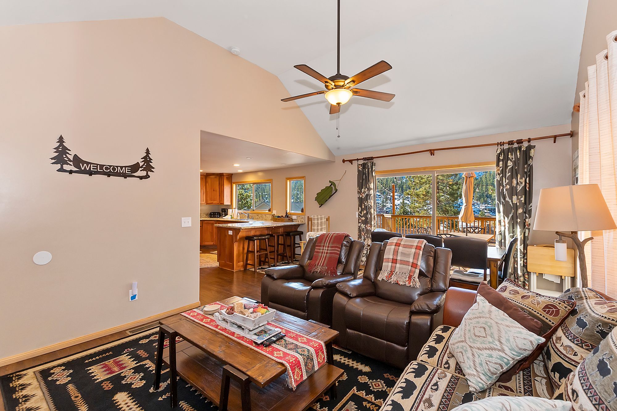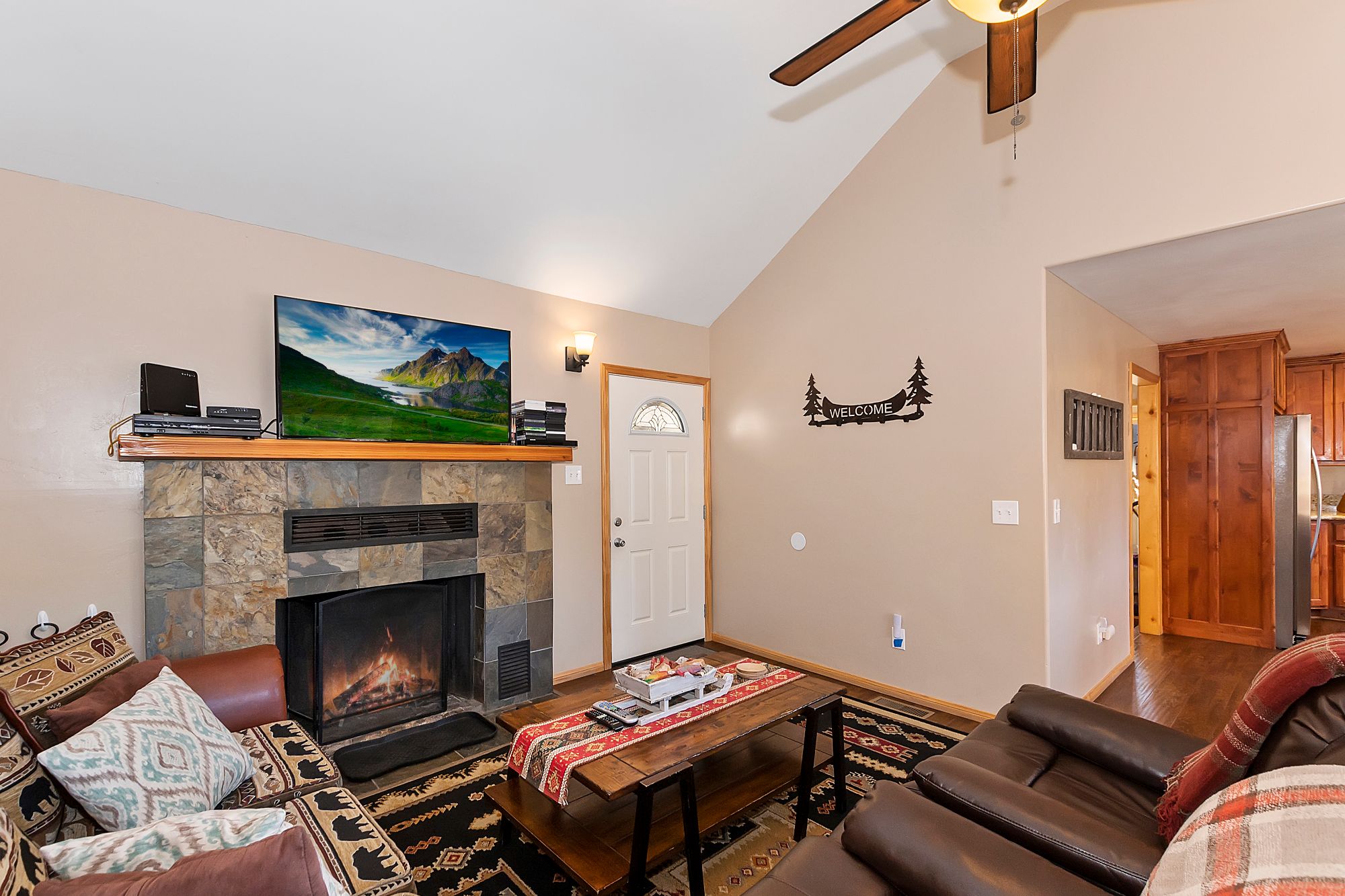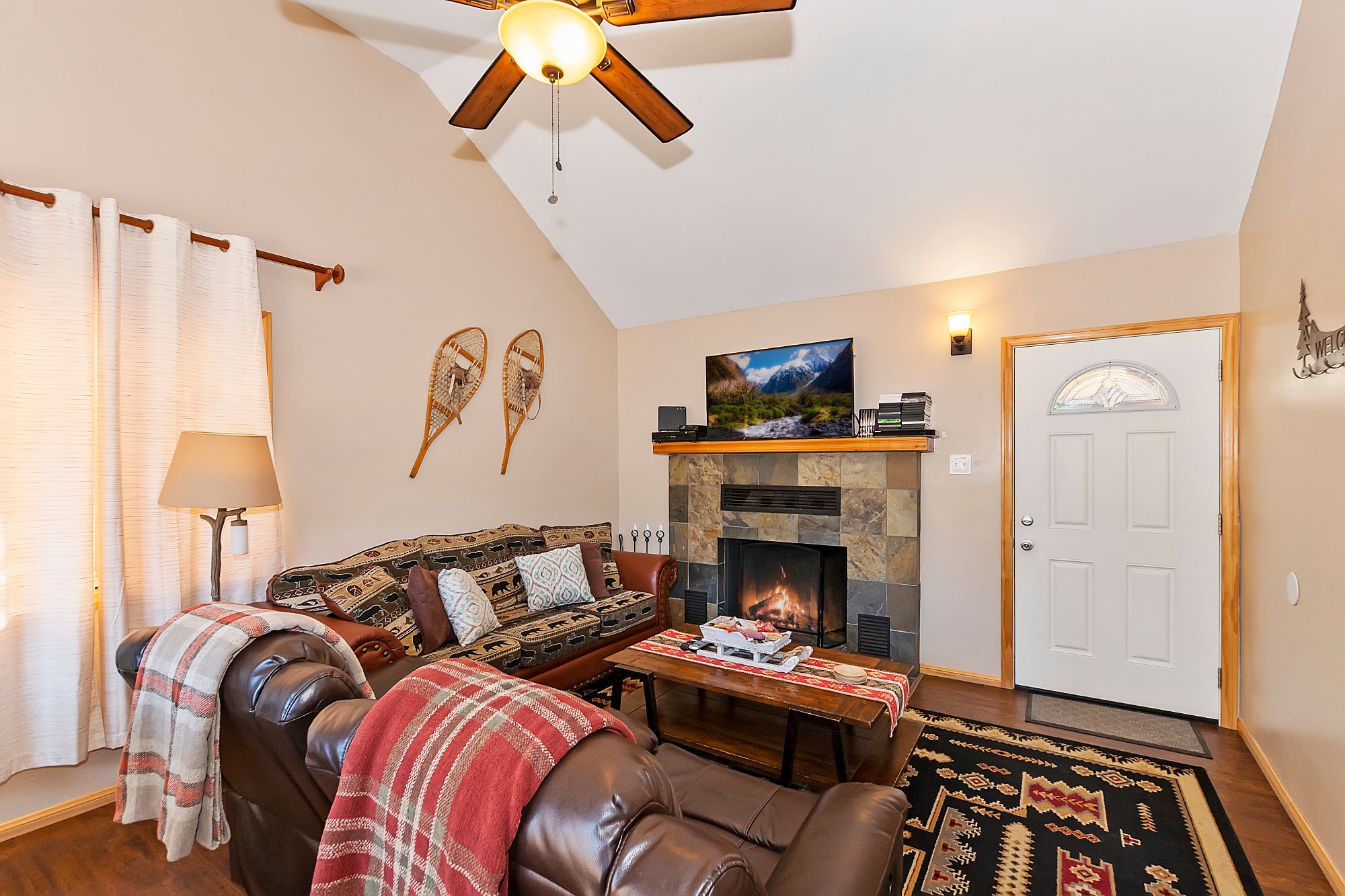 Step into the heart of Lakeview Retreat Chalet where the cozy family room welcomes you with leather sofas and chairs. Relax by the wood burning fireplace and watch your favorite movies on the flatscreen TV. The open-concept design fosters a warm and inviting atmosphere, perfect for family gatherings and creating lasting memories.