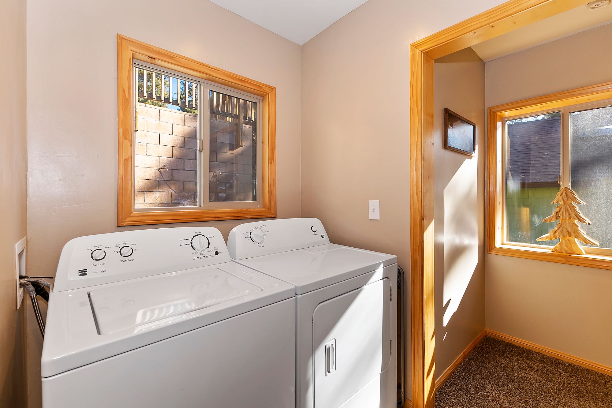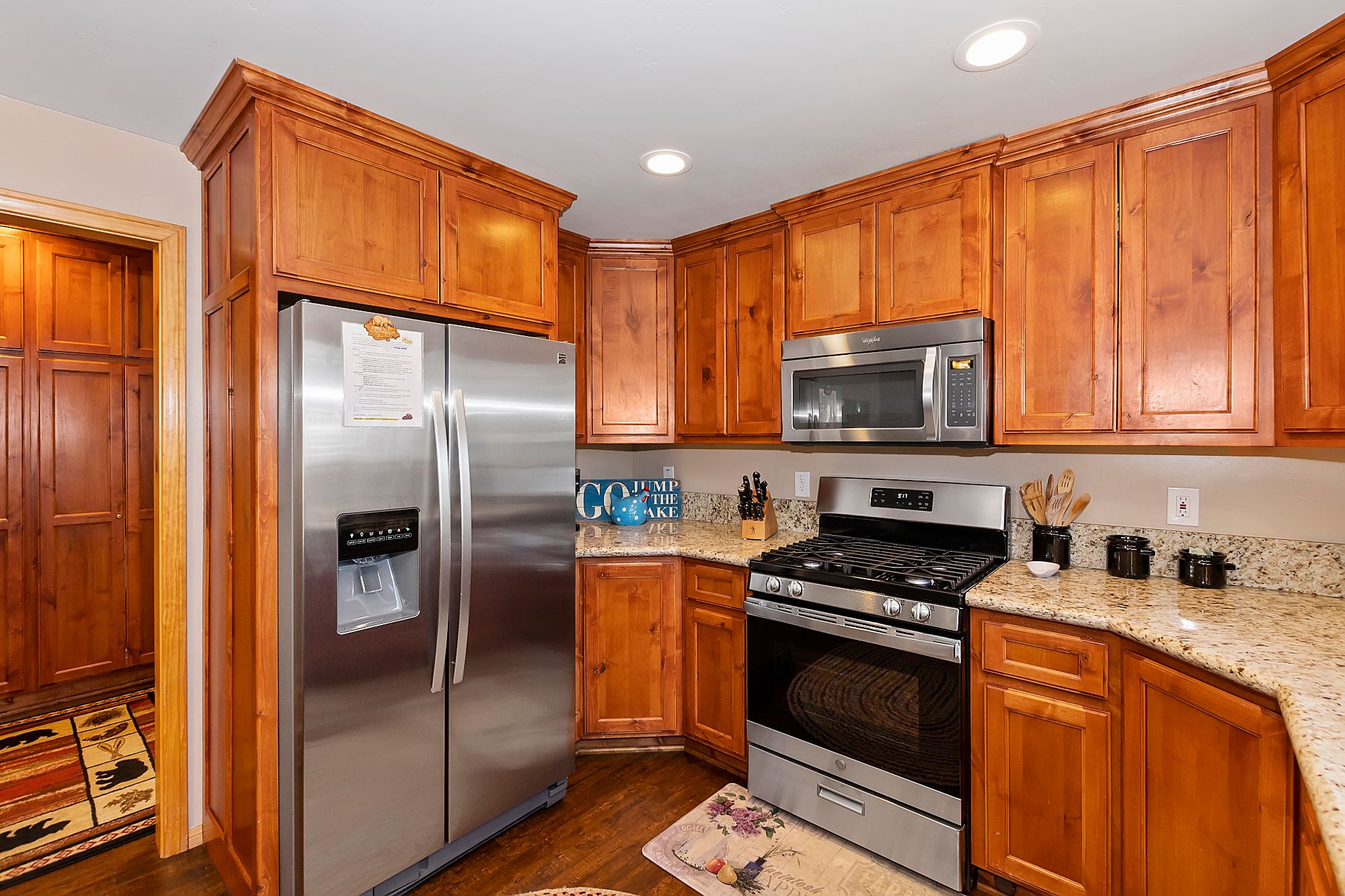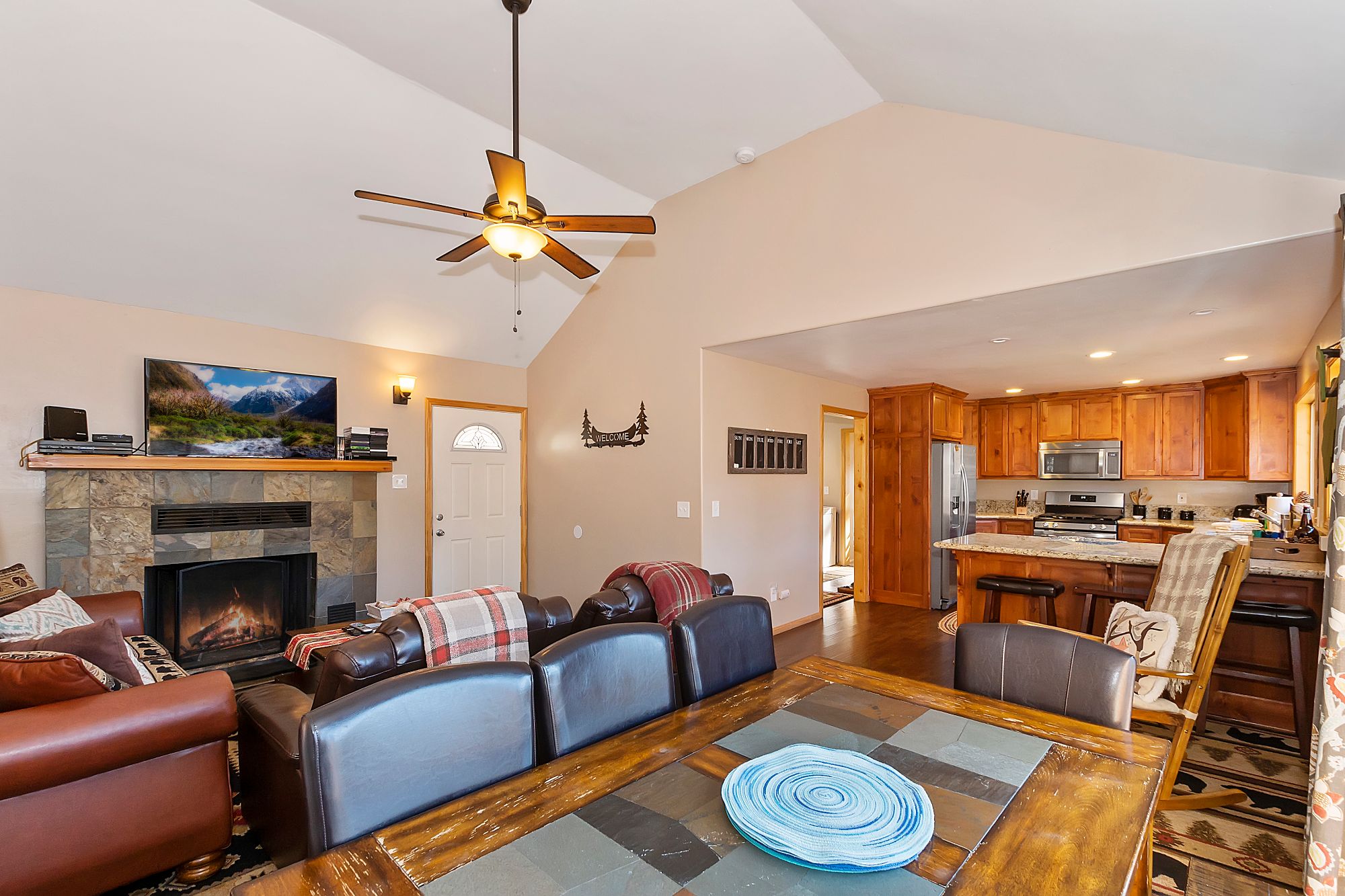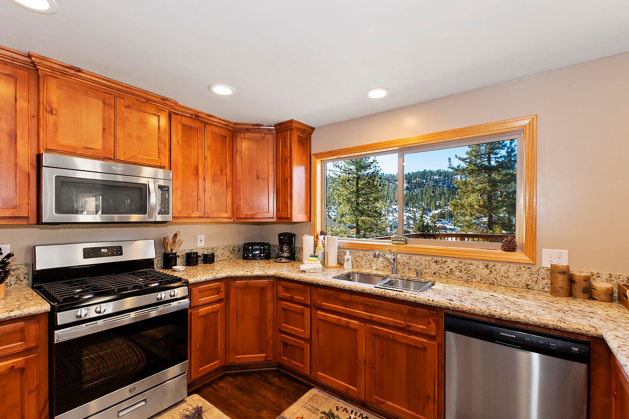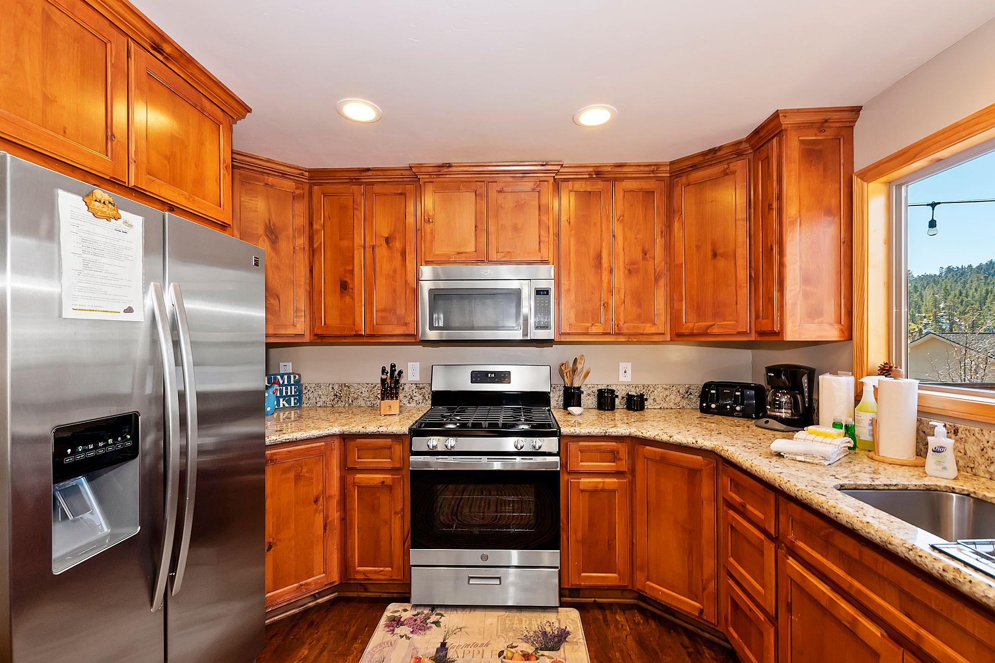 The fully equipped kitchen features stainless steel appliances, including a gas range/oven, microwave, fridge/freezer, and dishwasher. Granite countertops and a large window provide a view of the surrounding mountains and lake while you cook. The adjacent dining area includes a large table with seating for eight, plus additional seating at the kitchen countertop.