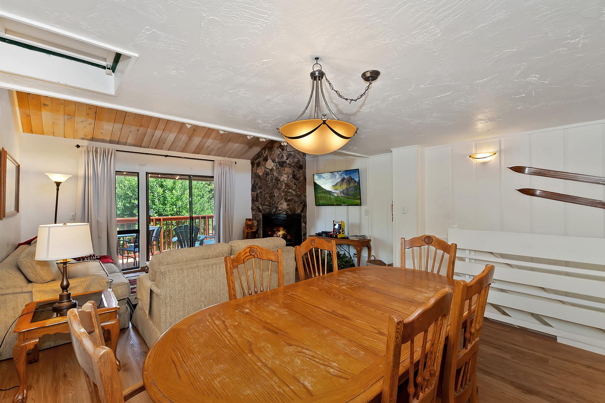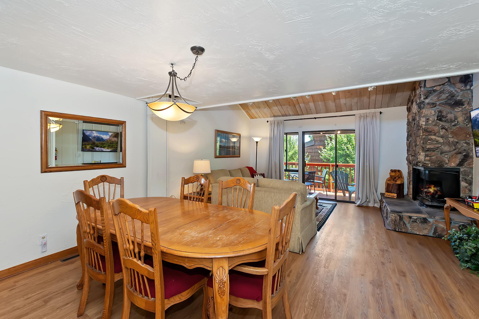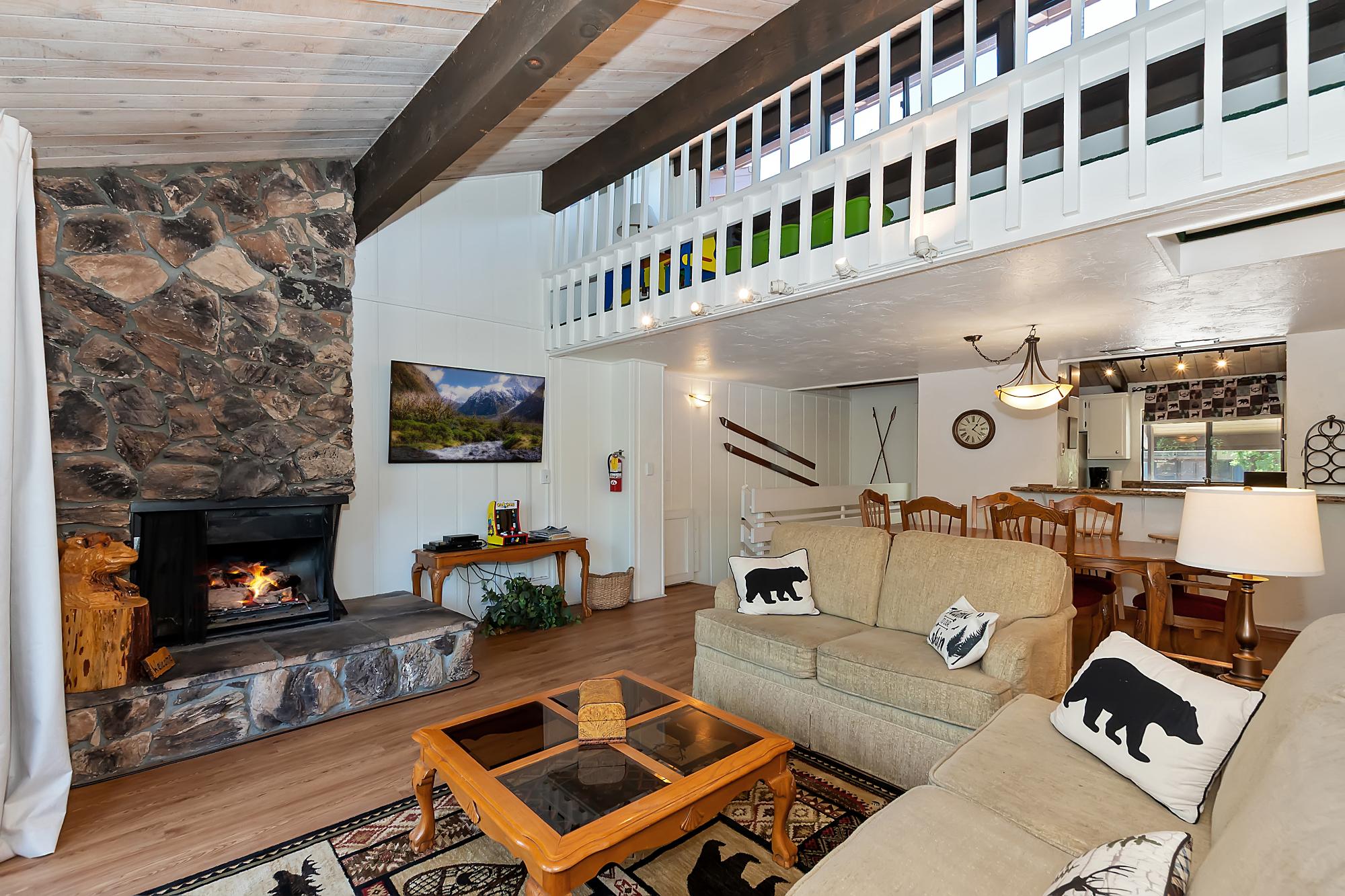 The upstairs living area is full of mountain charm with wood floors, leather couches, and a cozy gas-burning fireplace. Enjoy a movie night on the large smart TV with cable and DVD player, or gather around the dining bar for a family meal or board games.