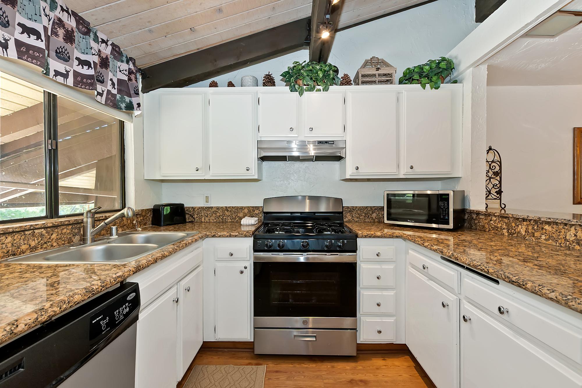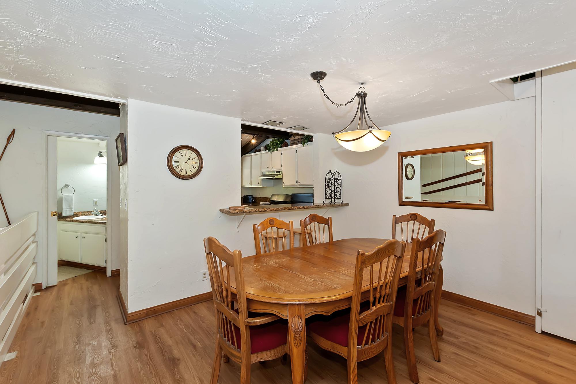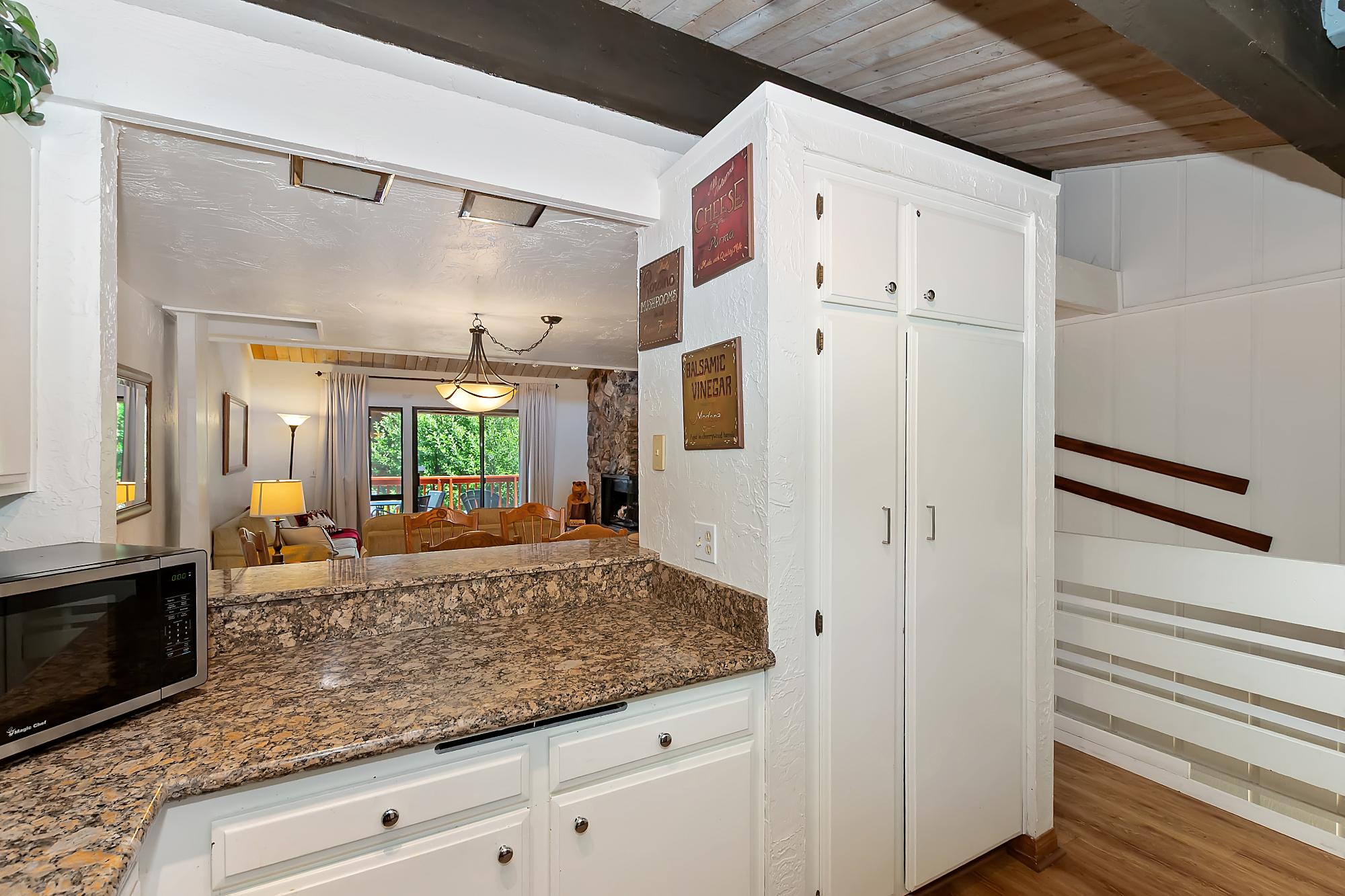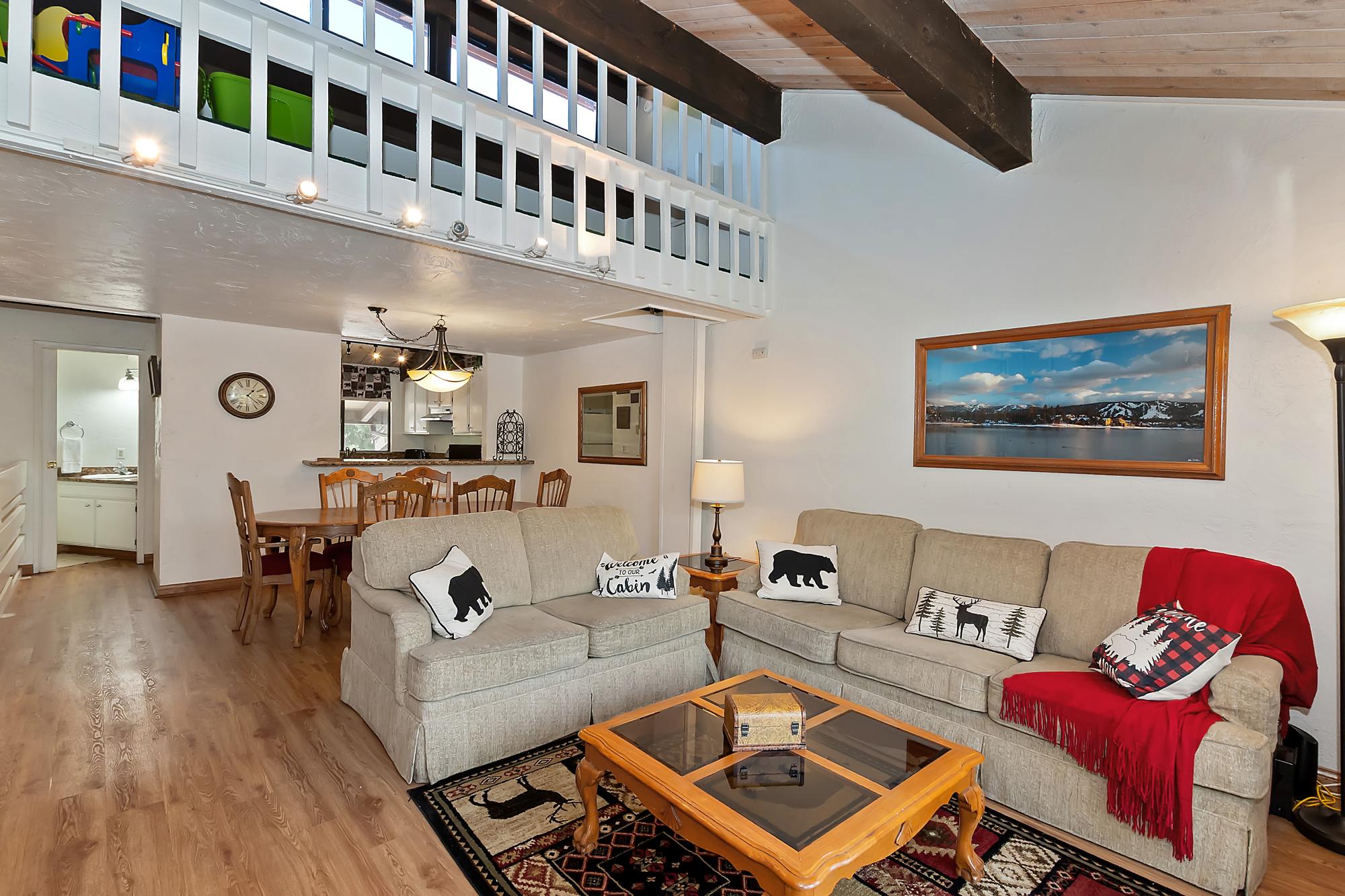 The upstairs living area is full of mountain charm with wood floors, leather couches, and a cozy gas-burning fireplace. Enjoy a movie night on the large smart TV with cable and DVD player, or gather around the dining bar for a family meal or board games.
