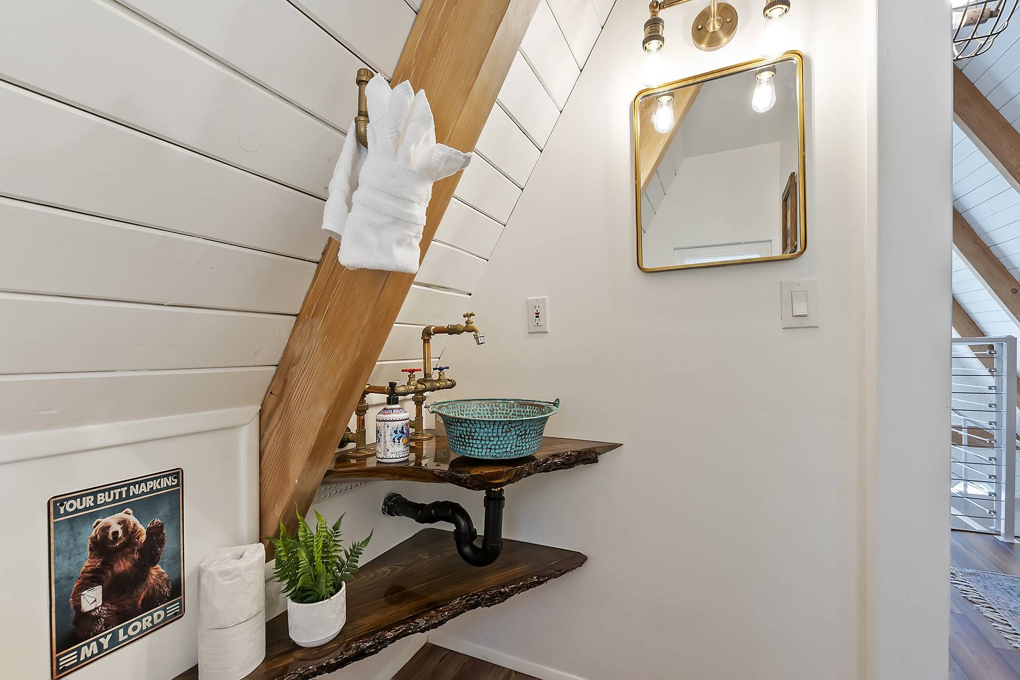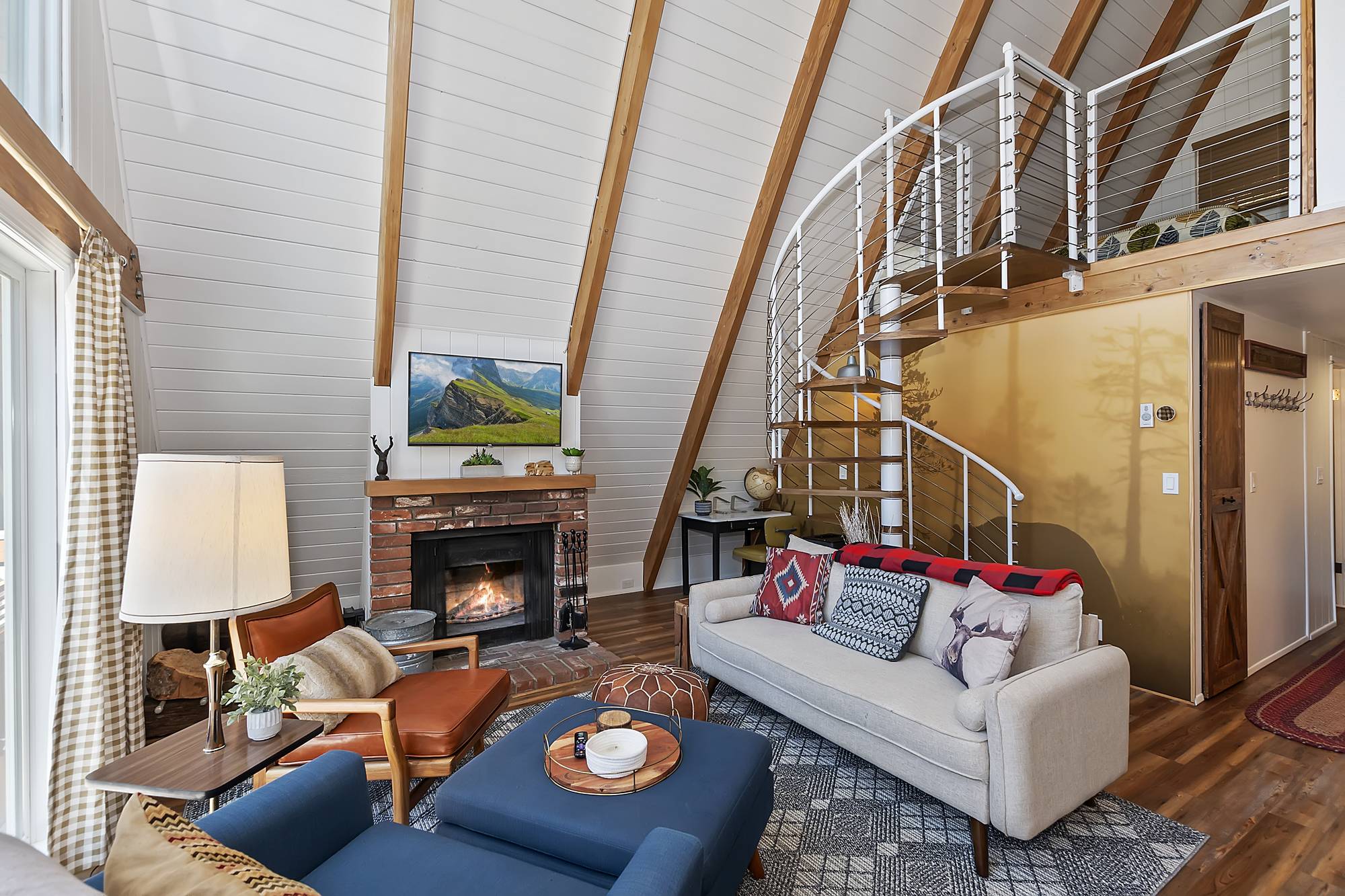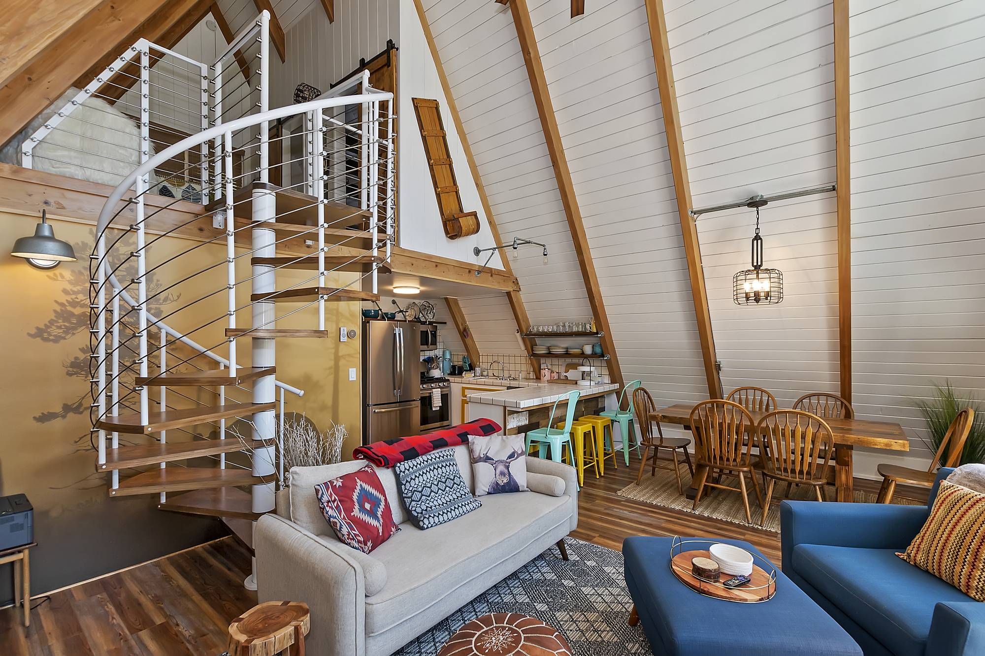 ✓ Second Bedroom: Head up the spiral staircase to the second bedroom, which features a queen bed, plenty of closet space, and a powder bath. The room’s character is highlighted by exposed fixtures, open shelving, and sliding barn doors.