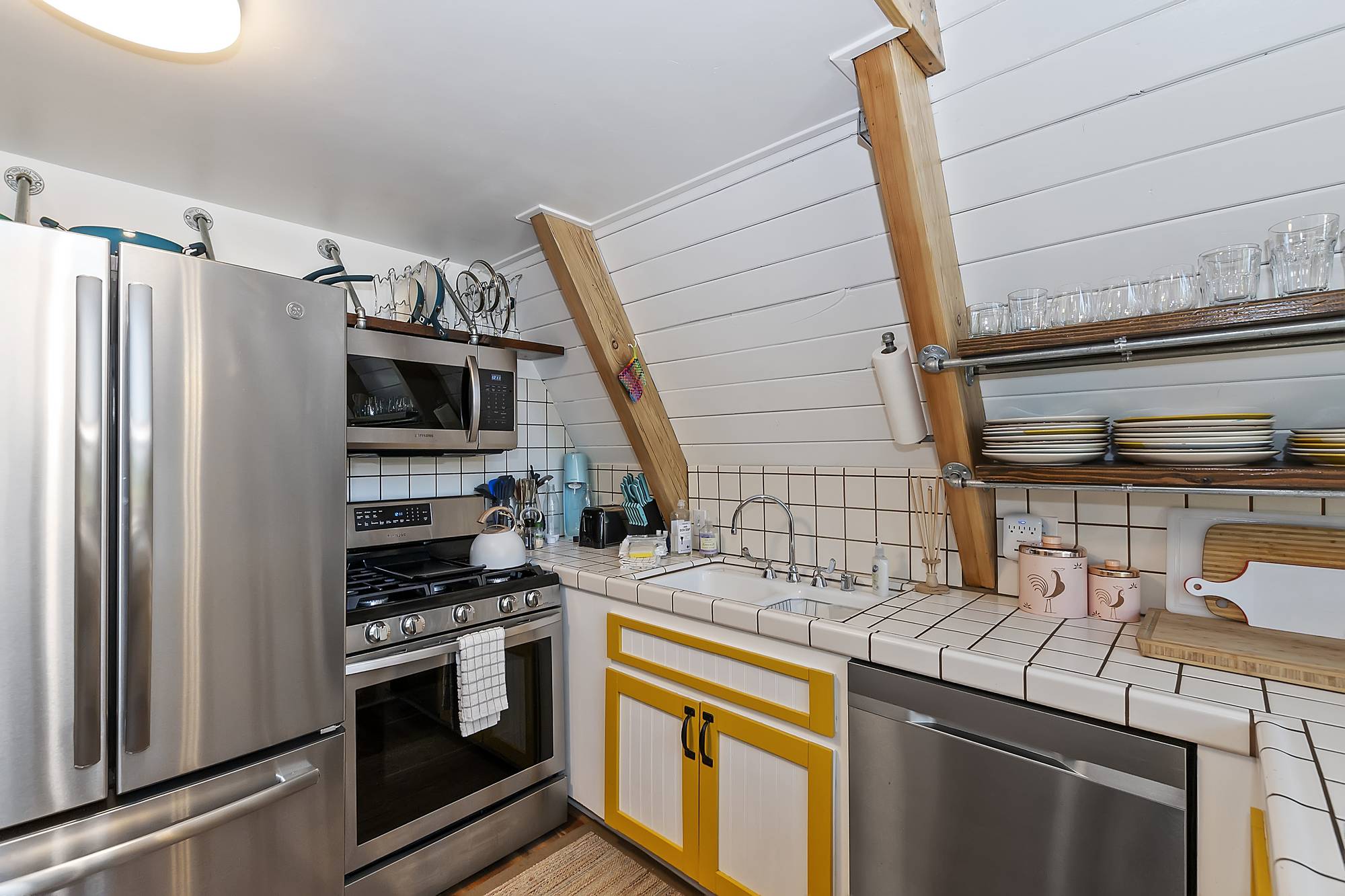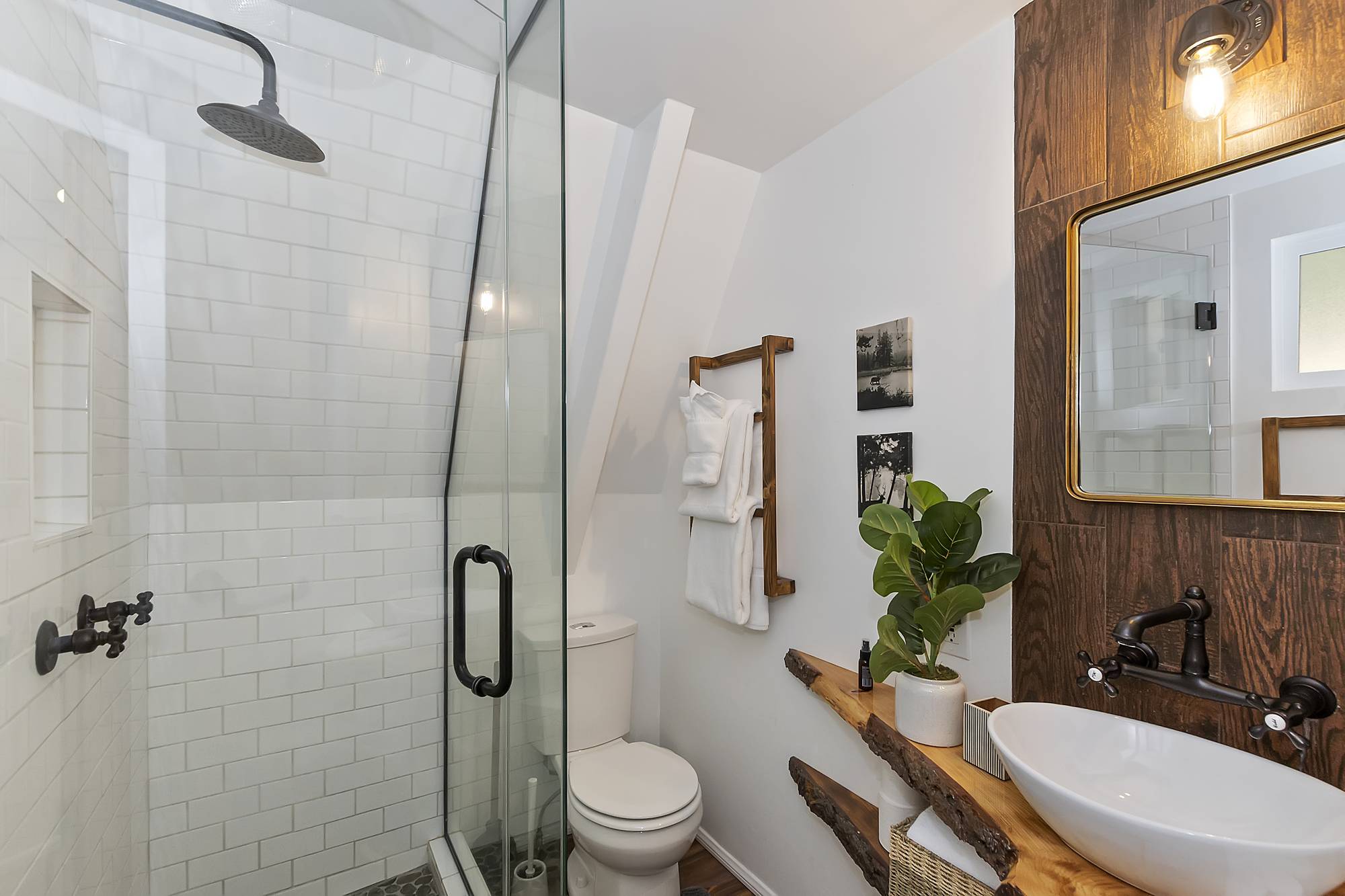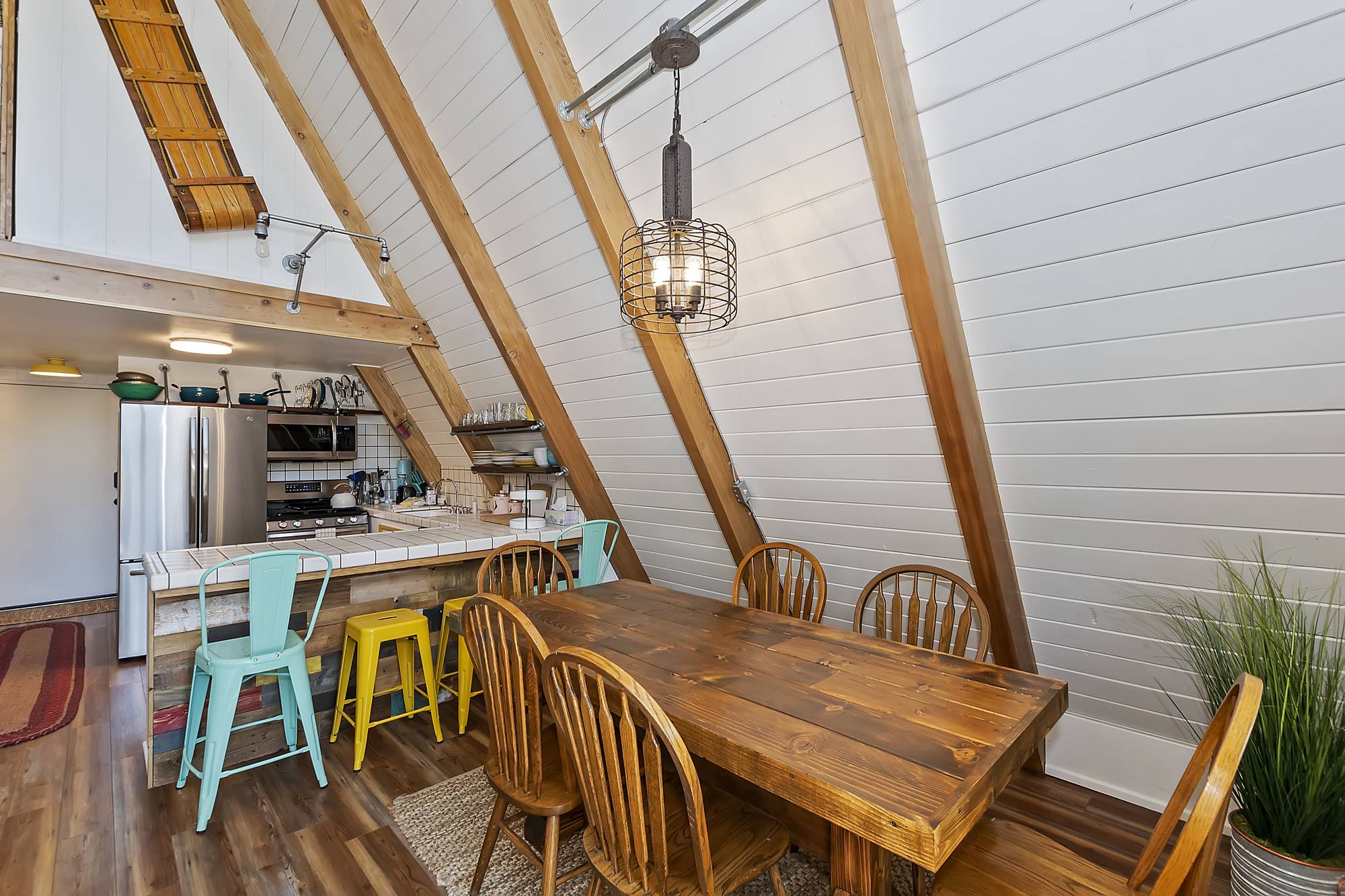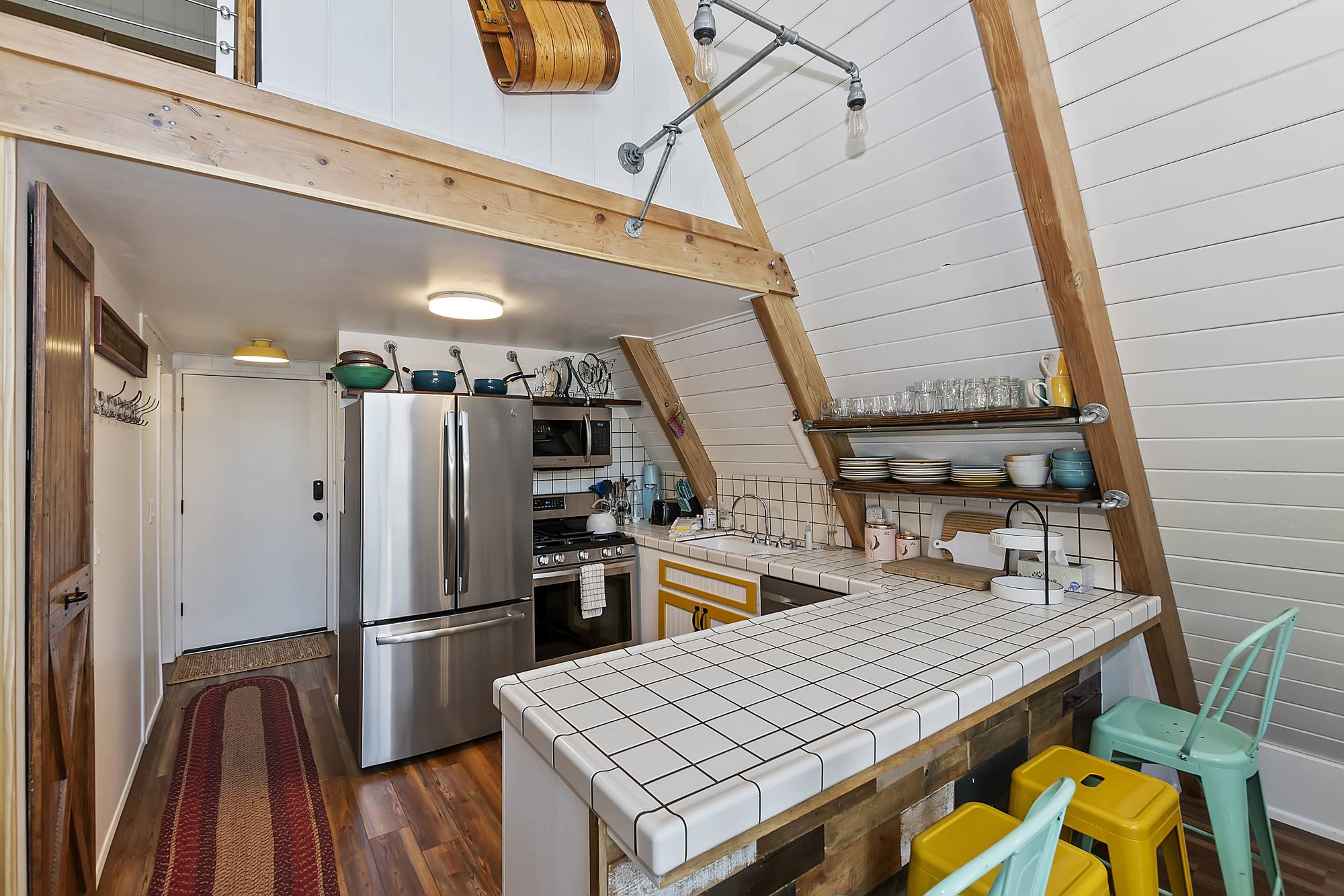 ✓ Second Bedroom: Head up the spiral staircase to the second bedroom, which features a queen bed, plenty of closet space, and a powder bath. The room’s character is highlighted by exposed fixtures, open shelving, and sliding barn doors.